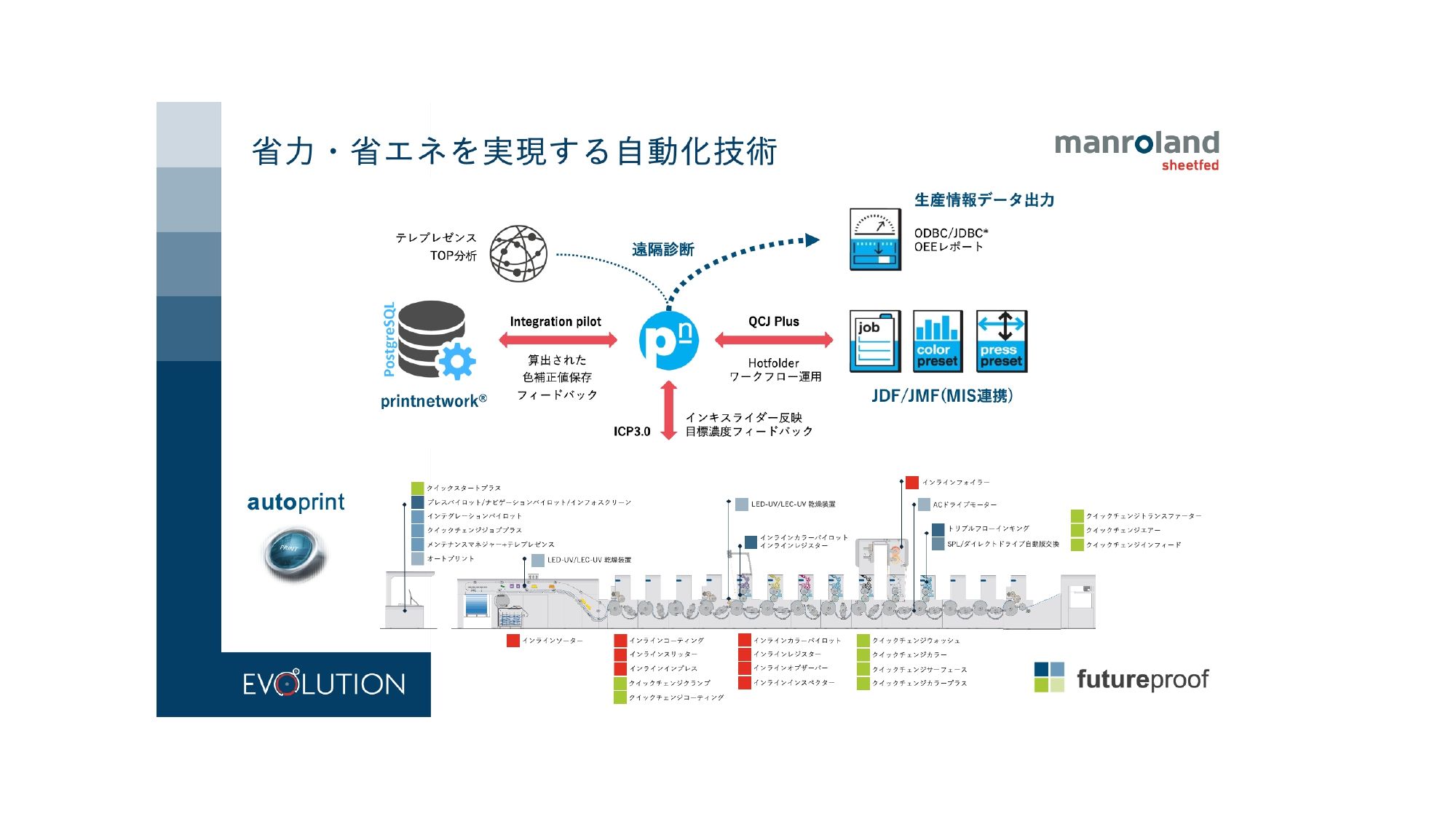 ドイツやオランダの工場では、現場の課題を一つずつ積み上げ、「将来どうありたいか」「今、何が現実的にできるか」を考えながら、結果として現場が自走できるスマートファクトリーを構築しています。実際、私が訪れたオランダの印刷工場では、2人のオペレーターでマンローランドのオフセット印刷機3台を稼働させ、小ロット多品種の中で1日3~4万枚規模のジョブ切り替えをスムースにこなしていました。それを支えていたのが、「インテグレーションパイロット」と「autoprint」です。スマートファクトリーに関心をお持ちの方には、ぜひ一度ヨーロッパの工場を見ていただきたいと思います。日本とは異なる考え方や生産環境に触れることで、多くのヒントが得られると思います。