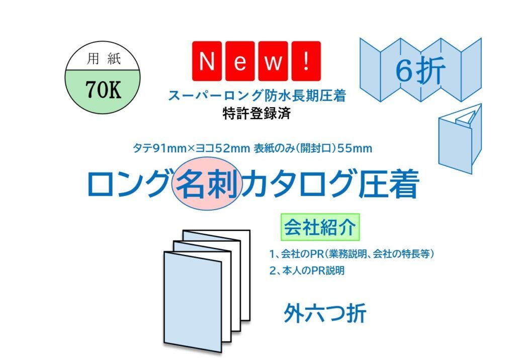 【KDK スーパーロング防水長期圧着シリーズ①】「ロング名刺カタログ圧着」会社の業務や特長、本人PR、販促カードをロング名刺カタログ圧着で9種の折加工、名刺サイズの新商品を開発