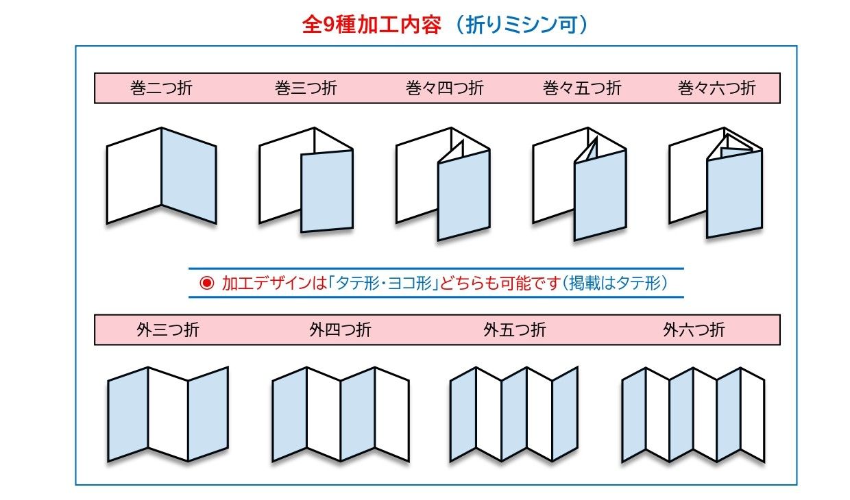 「ロング名刺カタログ圧着」用紙70k、6折、折りミシン可全9種の加工
