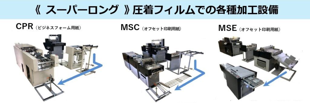 「スーパーロング防水長期圧着」は、名刺、DMハガキ、長3、A4、B5、A4サイズまで多様な折加工で圧着DMの郵便コストを削減している。最も需要の多い「名刺サイズ」や「圧着往復ハガキ」は、①名刺6折、②防水ロング圧着往復四つ折り2種類、③防水ロング圧着/ロング・特大ハガキ、④防水ロング圧着/ロング長3カタログ、⑤防水ロング圧着スジムカタログ2種類のスーパーロング防水圧着加工をラインナップする。