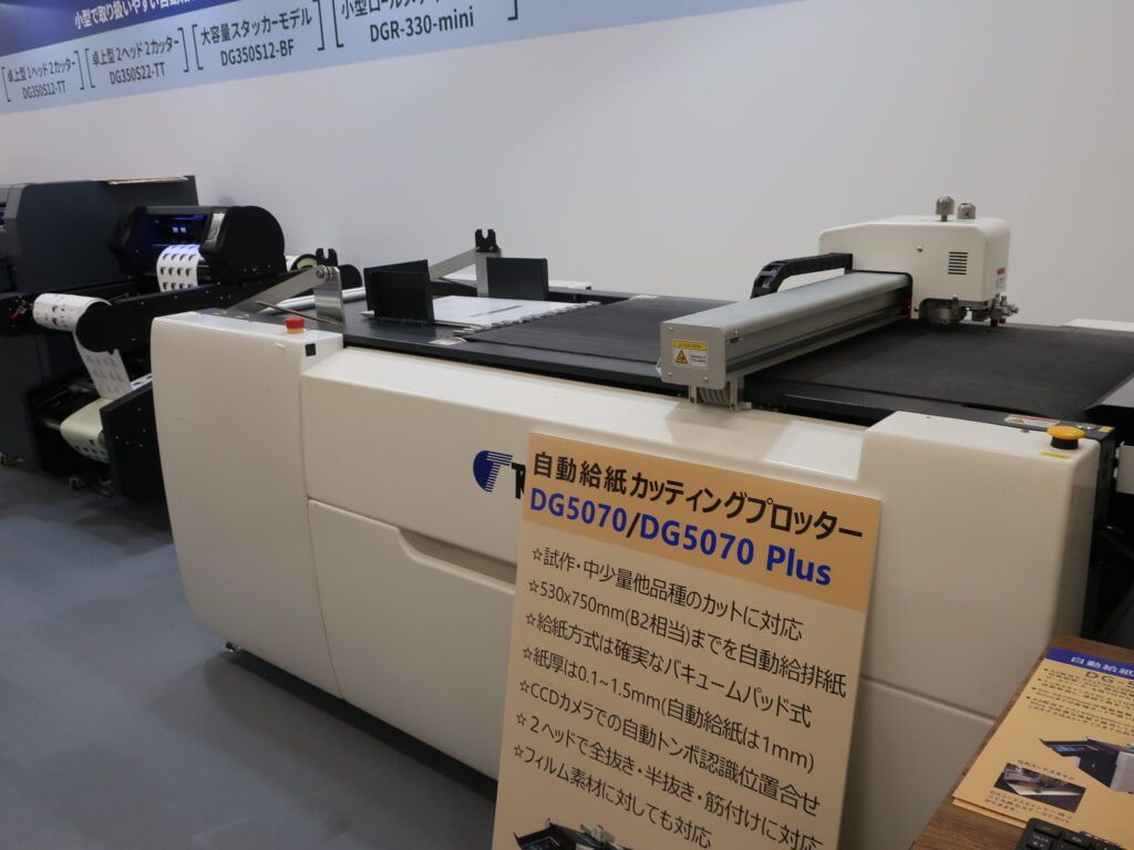 自動給紙付B2カッティングプロッター「DG-5070Ⅱ/Plus」は、B2相当サイズのシール、ラベル、コートボール等の紙器の加工を給紙、カット、排出処理まで全自動で処理する。バキュームパッドエアー給紙方式により自動で給紙され、2.0㎜までの幅広い紙厚を確実に給紙。ペーパーは120㎜の高さまでセットできる。