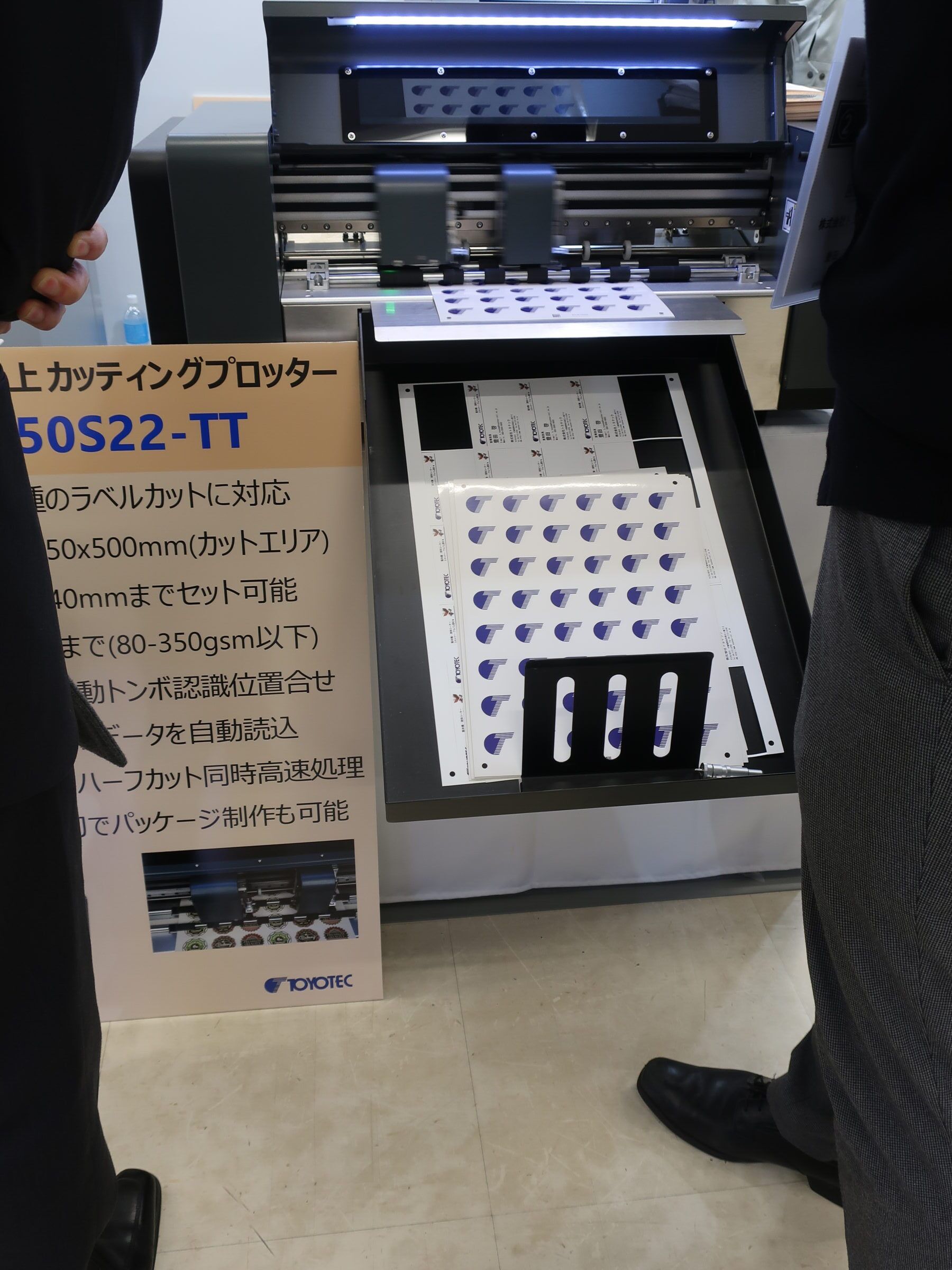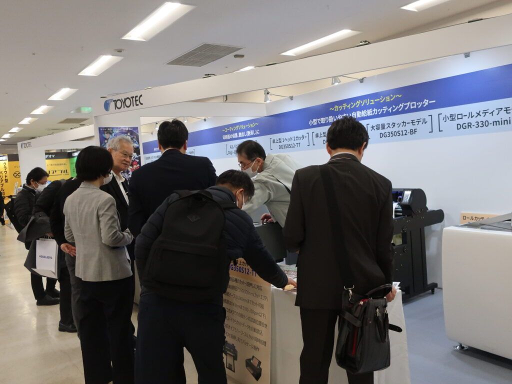 株式会社トヨテックは、シール、ラベル、パッケジ、PUR製本機を実演した。自動給紙付卓上型カッティングプロッター「DG350S22-TT」は、卓上型でA3ノビサイズまで給紙・カッティング・排紙ができ、試 作・少量多品種ラベルのカットに最適。2ヘッド2ナイフツール搭載により半抜き+全抜き、全抜き+筋入れが同時に2列で処理ができ、生産性が2倍になる。