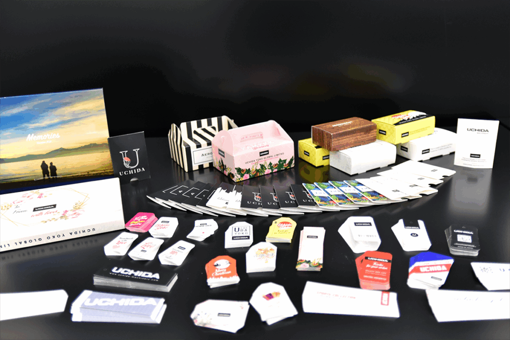 『AeroBond』で貼合した合紙は、ウチダテクノのカッター&クリーサー『AeroCut』シリーズや、オートフィードダイカッター『AeroDieCut』などで加工することで、カードやコースター、パッケージ、ヘッダー台紙・ブリスター台紙など様々な印刷商材を生み出せる。