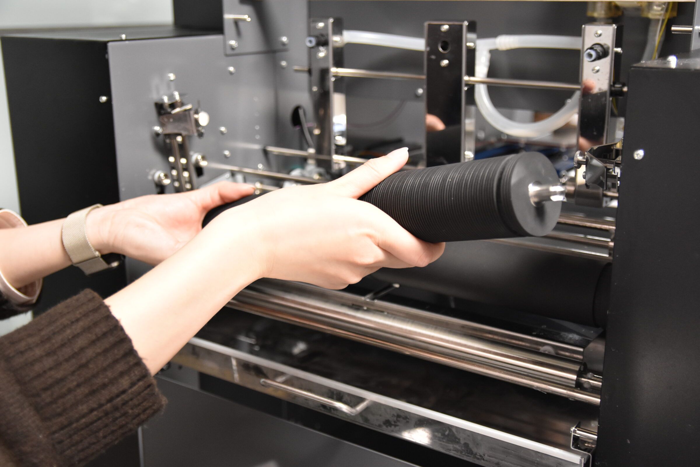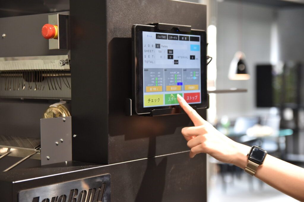 新製品は一昨年にドイツで開催された世界最大の印刷機材展drupa2026に参考出品され、国内外から注目を集めていた。国内ではオフセット印刷機で印刷した用紙を貼合する大型の合紙機が利用されているが、プロダクションプリンターの後加工に適応した小型のモデルは見られなかった。