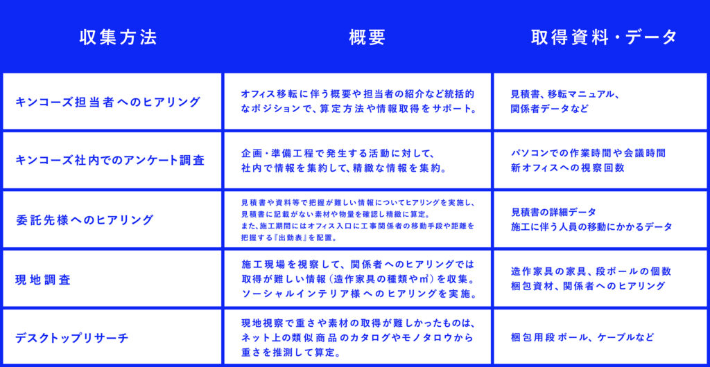 施工会社への直接ヒアリング、見積書を基にした物量ベースの算定、輸送管理シートや出勤表の活用など、実査に近い精度を追求した点が特徴となる。