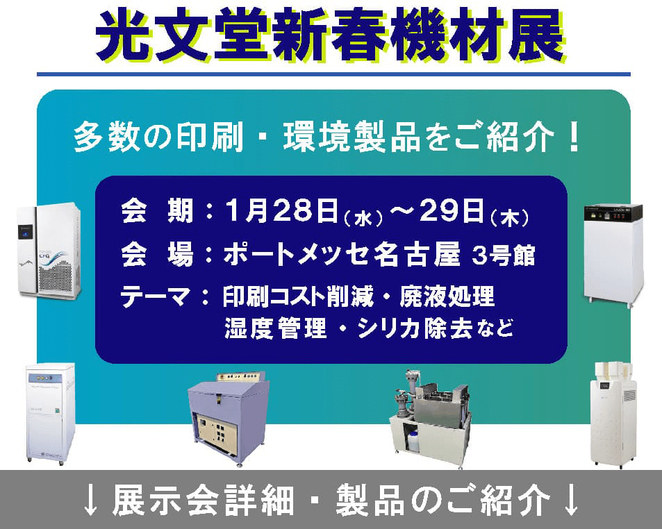株式会社コスモテックは1月28日と29日の2日間、ポートメッセ名古屋3号館で開催される「光文堂新春機材展」に出展する。同展示会では印刷コスト削減・廃液処理・湿度管理・シリカ除去など、印刷業界が直面する課題解決に向けた多彩な印刷・環境製品をラインアップする。展示会を通じて、効率的な生産環境の構築と環境負荷の低減を提案する。