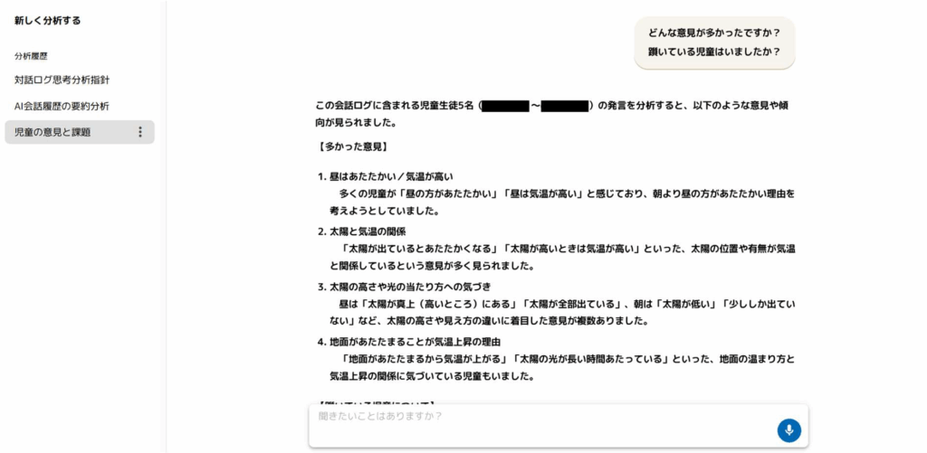 「対話ログ分析」は、児童生徒と生成AIの対話履歴をAIが分析し、「何について考えているか」「どのように思考が進んでいるか」といった観点や方向性を整理してリアルタイムで教員に提示する機能である。教員は個々の児童生徒の理解度や検討過程でのつまずきを正確に把握でき、次回に向けた課題の再設計や指導方法の見直しに活用できる。また、児童生徒一人ひとりの学びのプロセスを踏まえた適切な評価にもつなげる。