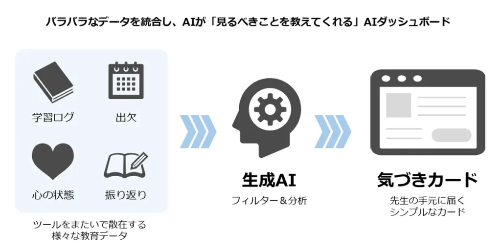 「先生×AIアシスト AIダッシュボード」は、ツールをまたいで散在する学習ログ・出欠・心の状態・振り返りといったさまざまな教育データを統合・可視化する。さらに、生成AIがデータを分析し、児童生徒に注意の必要な状況を検知すると「気づきカード」を教員に提示。教員が「気づき」を得て、「次の行動」につなげることを狙いとして設計されている。さらに必要に応じて詳細画面からグラフやデータで内容を確認したり、「 AIチャット」でAIに質問や相談をすることで、状況の深掘りも可能。出席日数や成績の変動といった客観的な数字データだけでなく、児童生徒の心の状態や学習の振り返りといった主観的なデータも重視し、複合的な要因から「気づき」を提示する。