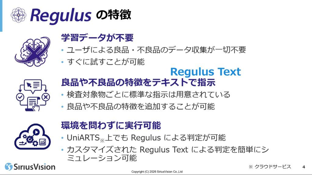 「Regulus」は、従来のAI検査の壁であった「大量の学習データ(良品・不良品画像)」の収集を一切不要とした画期的なシステム。熟練検査員の目に代わる「小さな王」を意味する名の通り、良品や不良品の特徴を「テキスト」で指示するだけで判定基準の設定が可能となっている。 同システムは「FlexVision」と組み合わせることで、クラウドサービス「UniARTS」上でも実行できる。これにより、シミュレーションによる判定の最適化も容易となり、多品種少量生産の現場においても、設定の手間をかけずに即座にAI検査を導入できる。