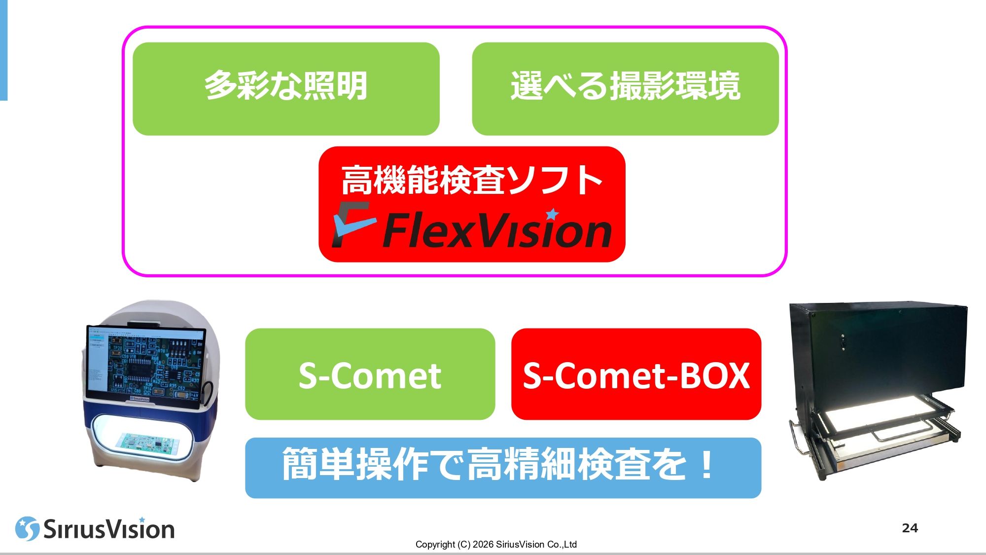 「S-Comet」は、「Regulus」と独自の検査アルゴリズムを搭載した高速高精度な画像検査ソフトウエア「FlexVision」を搭載した卓上型の検査機。生産工程における抜取検査や最終検品に特化に特化している。1画素あたり10μmという高解像度により、微細な傷、汚れ、印字不良を数秒で検出可能。電子基板やラベル、パッケージ、アクリル製品など、多様な媒体の検査に対応している。 最大の特徴は、独自の画像検査アルゴリズムにより「過検出」を極限まで抑えつつ、初心者でも手軽に導入できる操作性を備えている点にある。検査対象を斜めに置いた場合でもソフト上で自動補正する機能を搭載しており、属人化しがちな目視検査を誰でも高精度に行える環境を提供する。