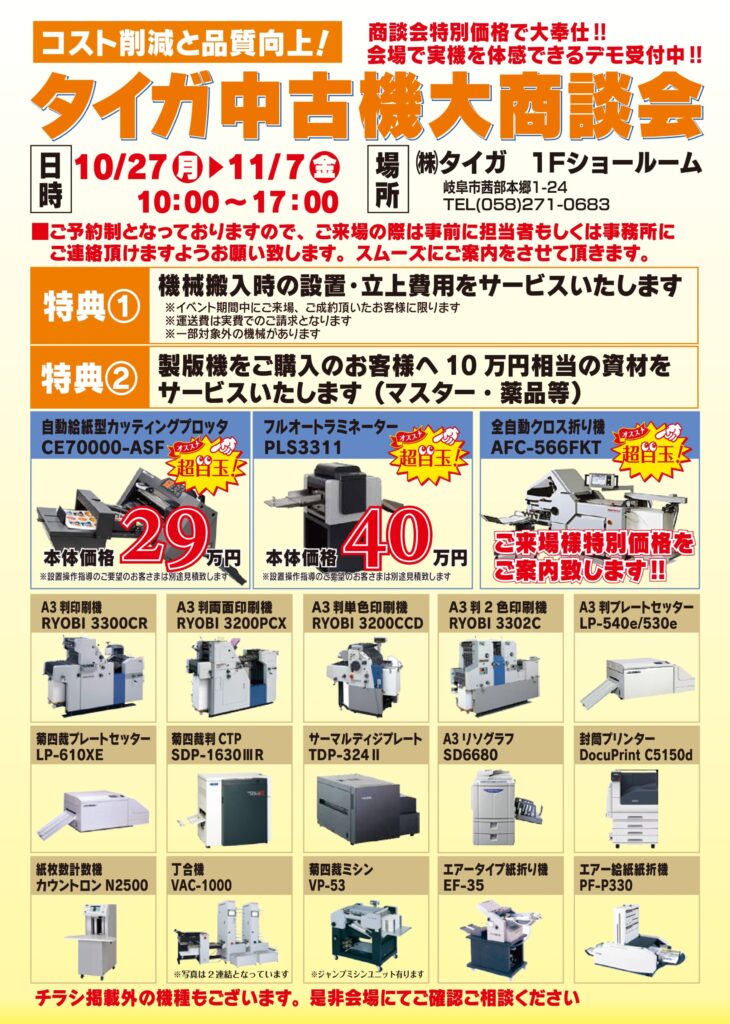 株式会社タイガは、10月27日から11月7日まで「タイガ中古機大商談会」を本社1階ショールームで開催。期間中は商談会特別価格での販売に加え、実機のデモンストレーションを実施。中古機の導入や設備更新を検討する企業に向け、コスト削減と品質向上の両立を提案する。