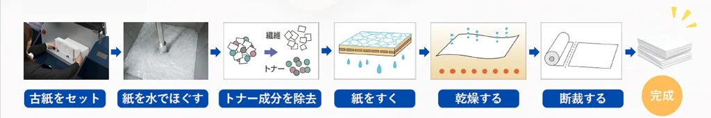 同機は、使用済み古紙を水に溶かして繊維レベルまで完全に離解する独自システムを採用。シュレッダー以上の機密保持性能を誇り、外部委託することなく社内で安全に機密文書を処理できる。再生された紙は繰り返し再生が可能で、紙の調達や輸送に伴うCO2排出の削減にも大きく寄与する。