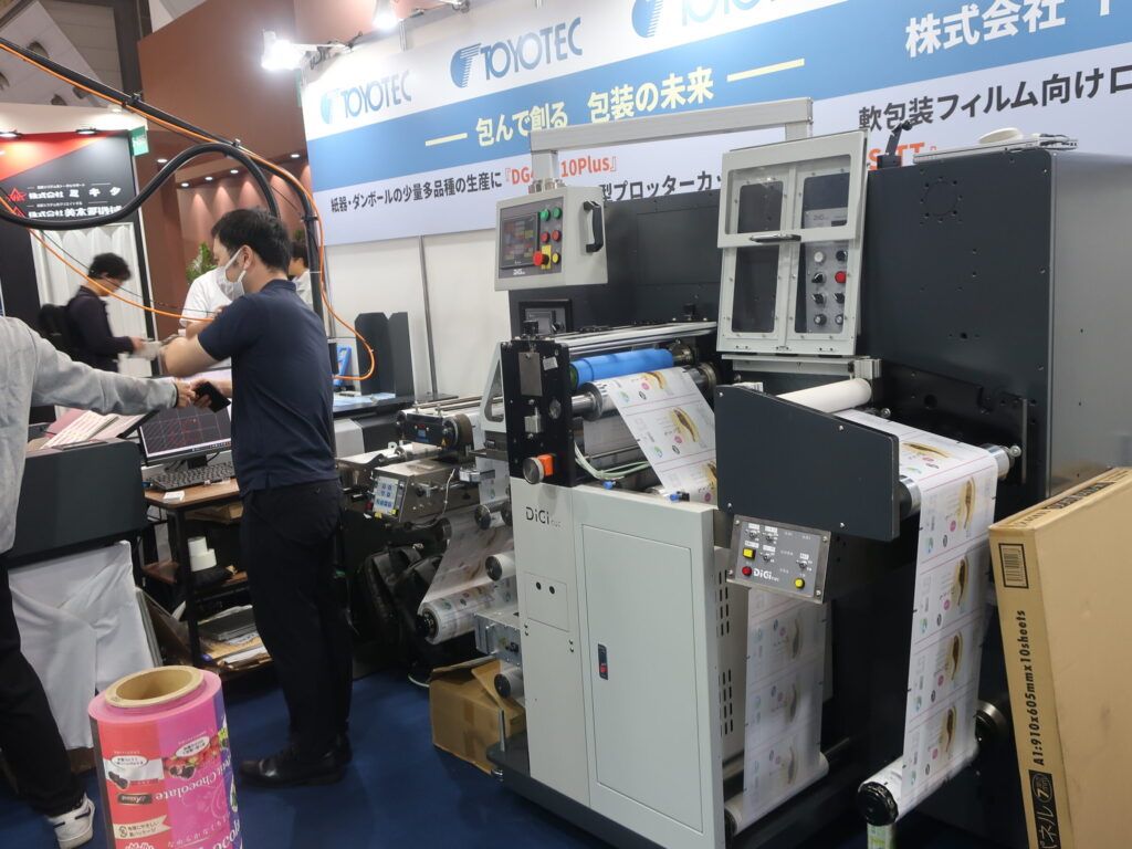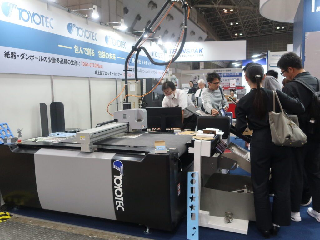 トヨテックJAPAN PACKに抜型資材メーカーの大創と共同出展、少量多品種生産に最適な自動給紙プロッターカッター、ロールメディア対応ニスコーターの最新加工ソリューションが注目