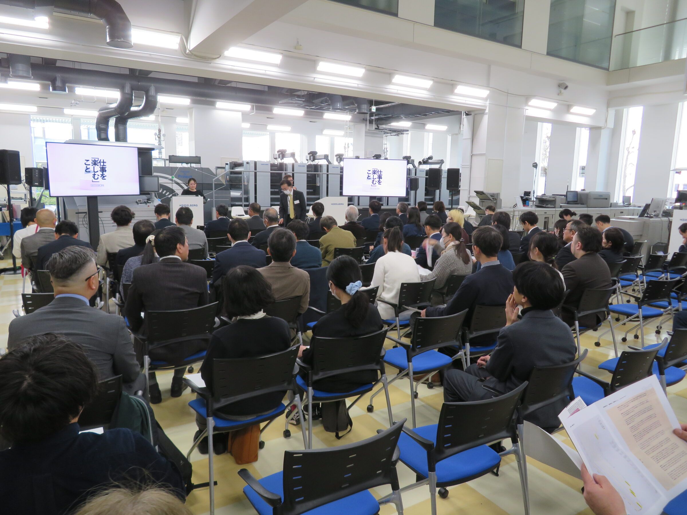 冒頭、篠原会長は「今日聞いた話を自社の課題と重ね、背中を押されるような場になればいいと思います」と挨拶。印刷産業に関わる仕事を誇りを持って続けられる業界づくりへの思いを述べた。