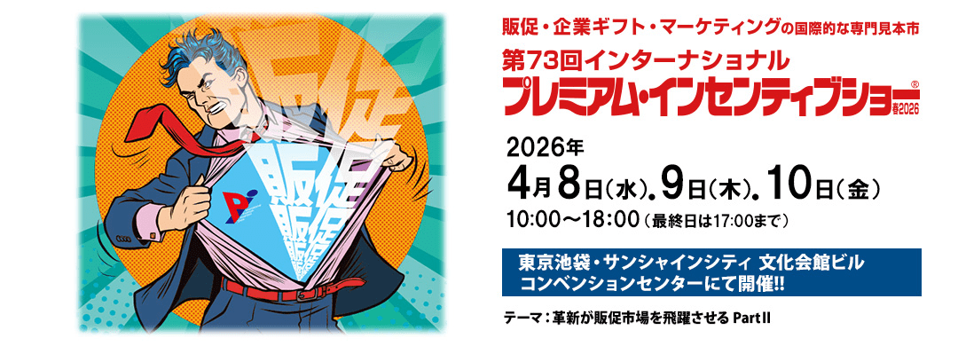株式会社ビジネスガイド社は、4月8日から10日までの3日間、東京・池袋サンシャインシティ 文化会館ビル コンベンションセンターで「第73回インターナショナル プレミアム・インセンティブショー春2026」を開催する。販促・企業ギフト・マーケティングの国際的な専門見本市として、企業の販促活動に関わる商品やサービスを一堂に集め、販促市場の最新動向を紹介する。