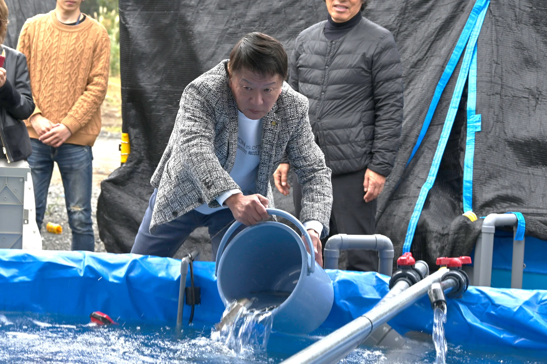 今回完成した設備は、地域に存在する水資源を生かしながら、陸上環境でサーモンを育てるための試験用施設。放流式には同社関係者に加え、施工を担当した有限会社ひらやまの関係者も出席した。設備確認後、初期群として1,500匹のサーモンが生け簀へ放流され、育成が始まっている。