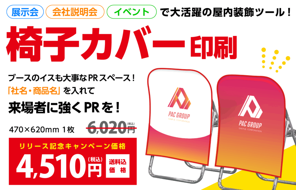 印刷通販プリントパックは、展示会や会社説明会、各種イベントでの集客力向上に寄与する新商品「椅子カバー印刷」の提供を開始した。現在はリリースを記念し、キャンペーン価格での提供を行っている。