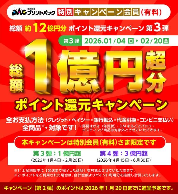 印刷通販プリントパックは「総額1億円分ポイント還元キャンペーン(第3弾)」を開始した。