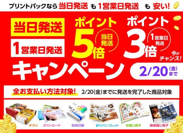 プリントパック 当日発送・1営業日発送の超短納期商品のポイント還元キャンペーン開催 2月20日まで