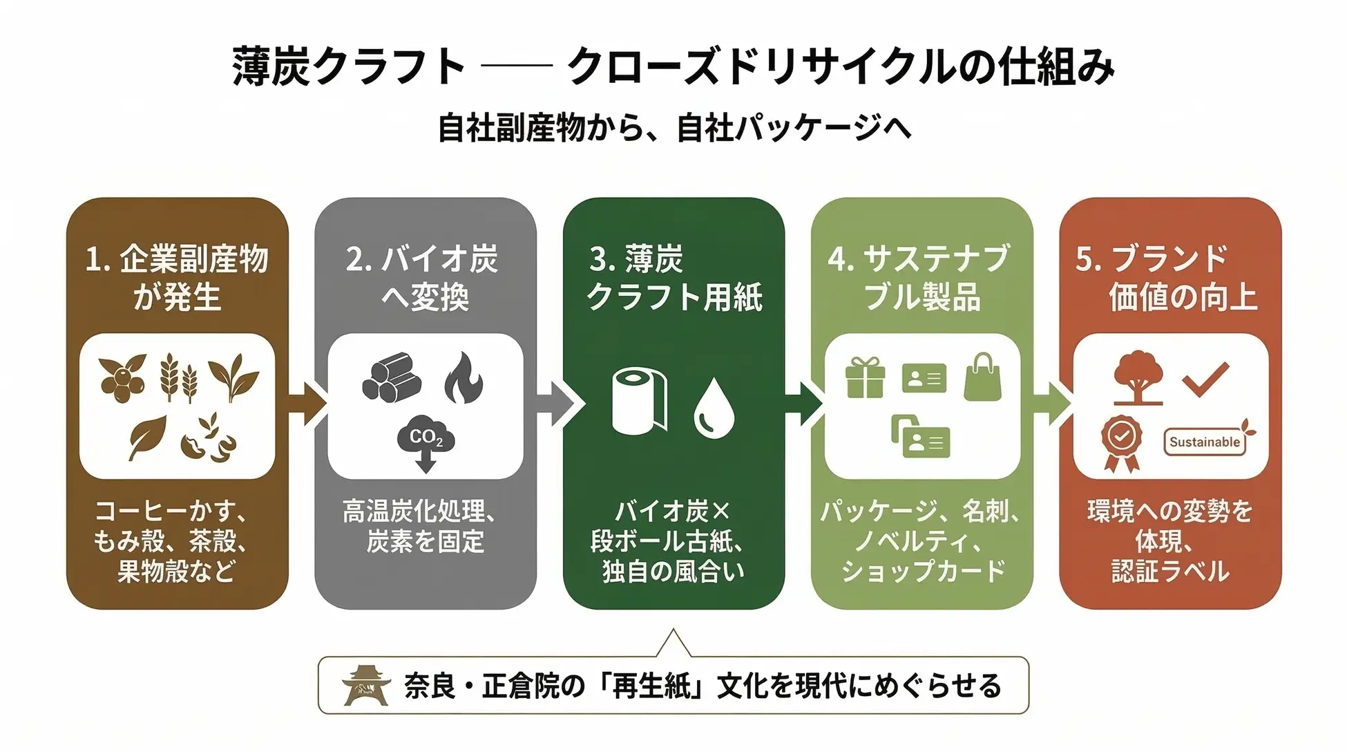 この技術の基盤となったのは、ペーパルが2025年に開発した「薄炭クラフト」。奈良時代にはすでに墨で書かれた紙を漉き返して再利用する文化があり、平安時代にはこうした再生紙が「宿紙(しゅくし)」と呼ばれていた。その漉き返しで生まれた淡い灰色の風情をバイオ炭と段ボール古紙で再現した紙を薄炭クラフトとして発売し、以来、話題となっている。