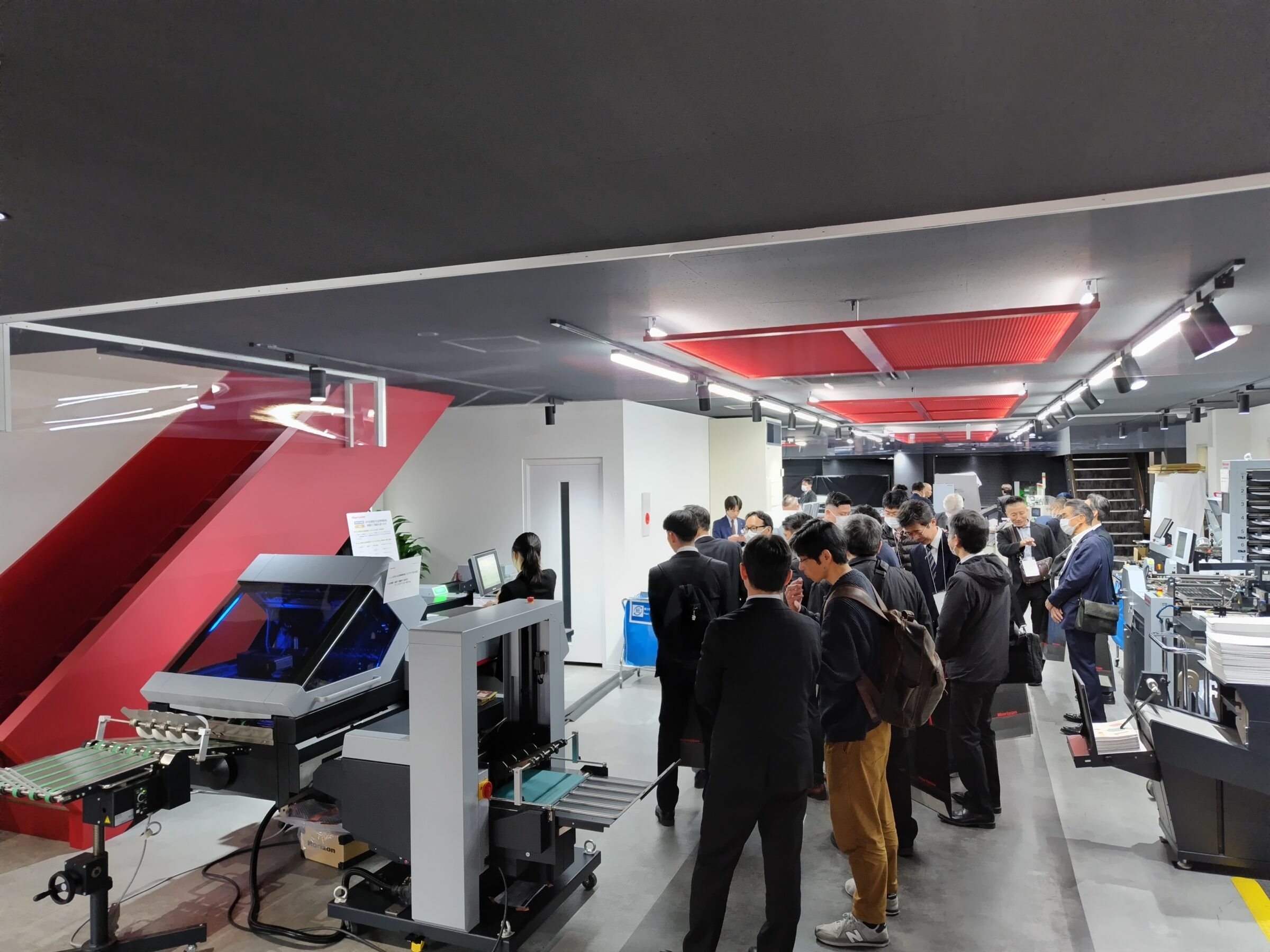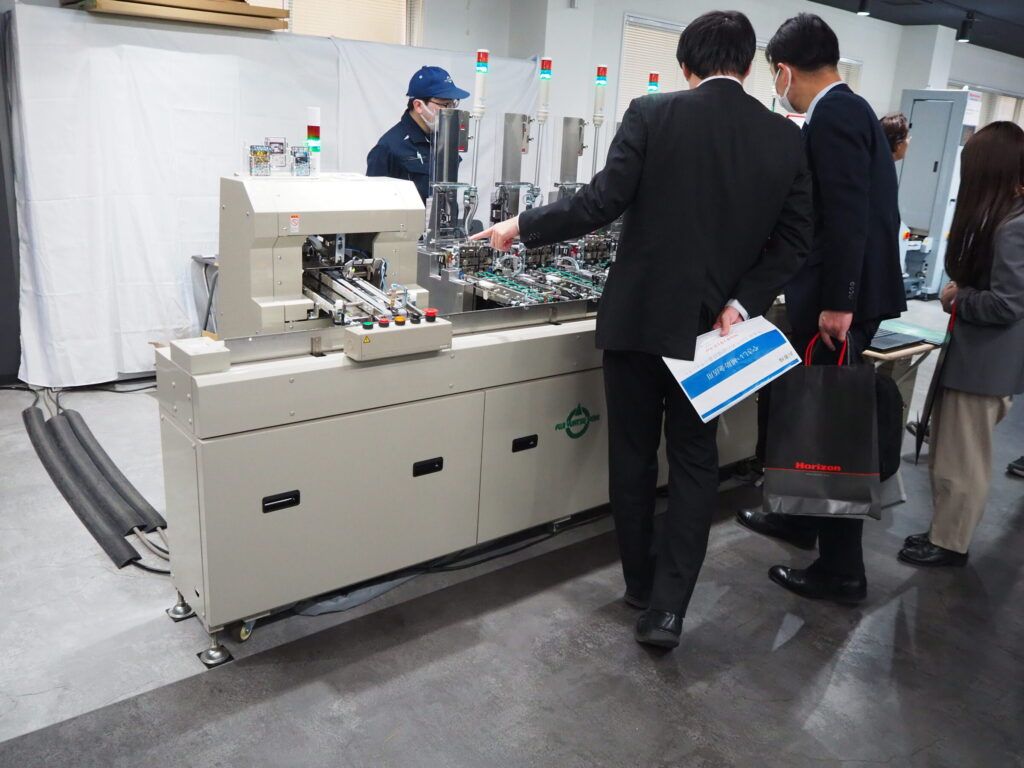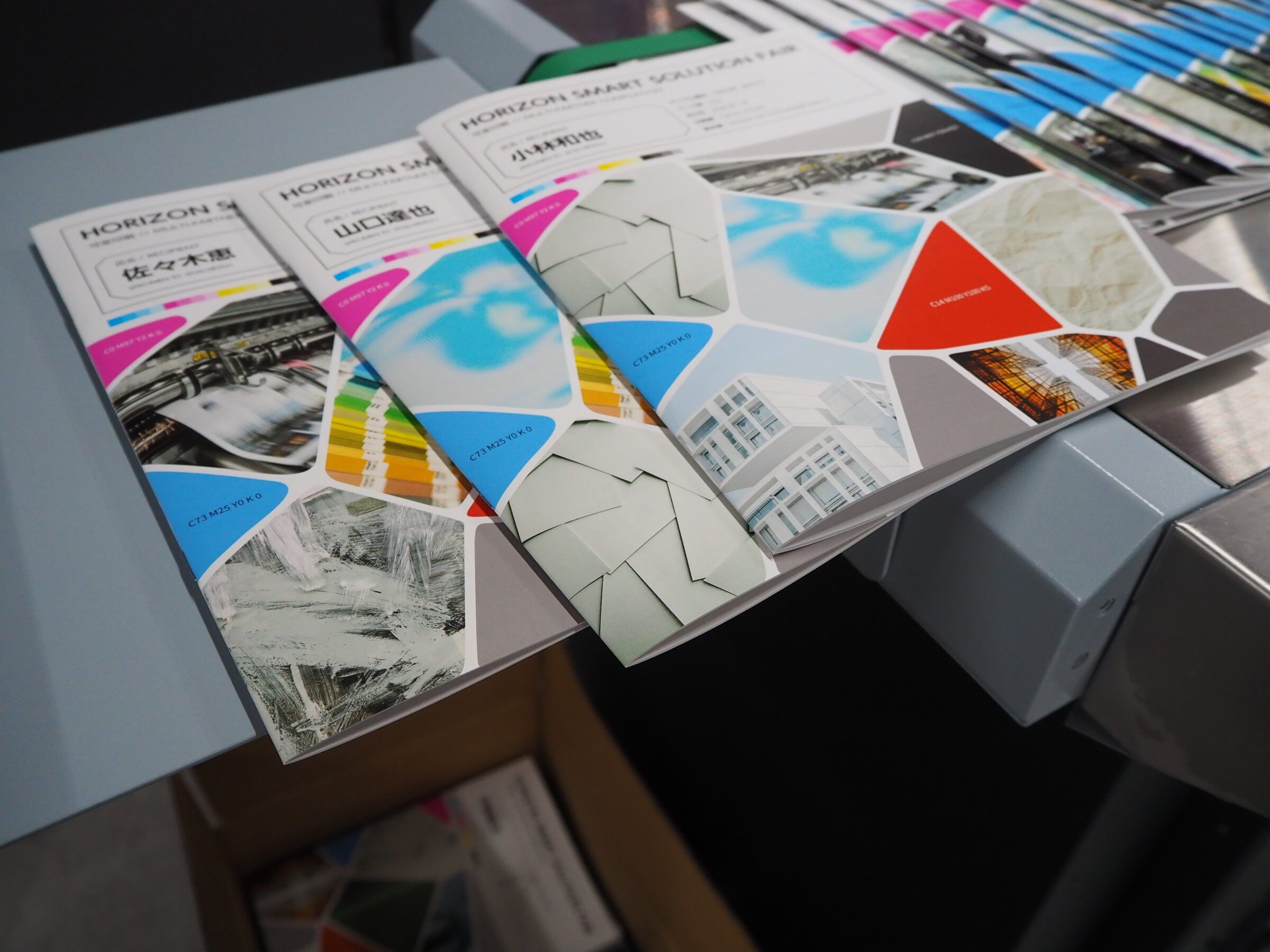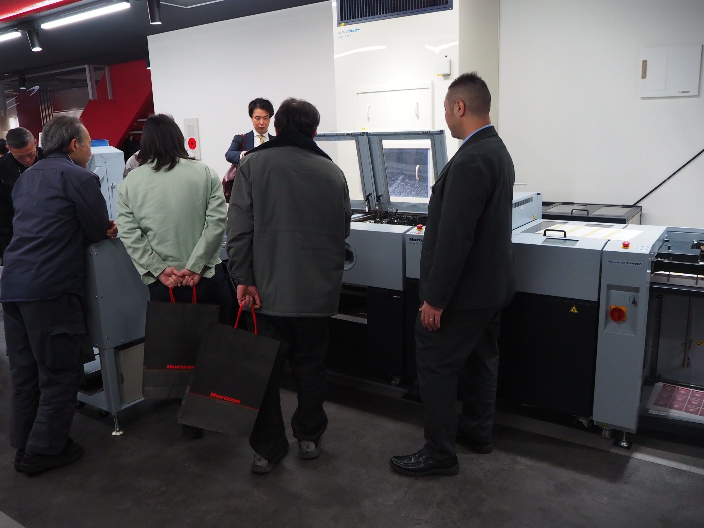 フェアではハードウェアからシステム構築まで柔軟なソリューションにより生産効率と製品品質の向上、新商材・サービス開発を支援する印刷工場全体の最適化を提案。デモンストレーションでは①ダイカット機、②カード丁合機、③デジタル印刷対応中綴じ機StitchLiner Mark V、④糸かがり製本機 FX-50、⑤中綴じ包装機+協働ロボットパレタイズ+AGVでの自動搬送を紹介している。また、ホリゾン新入社員による折り機の実演も注目を集めている。