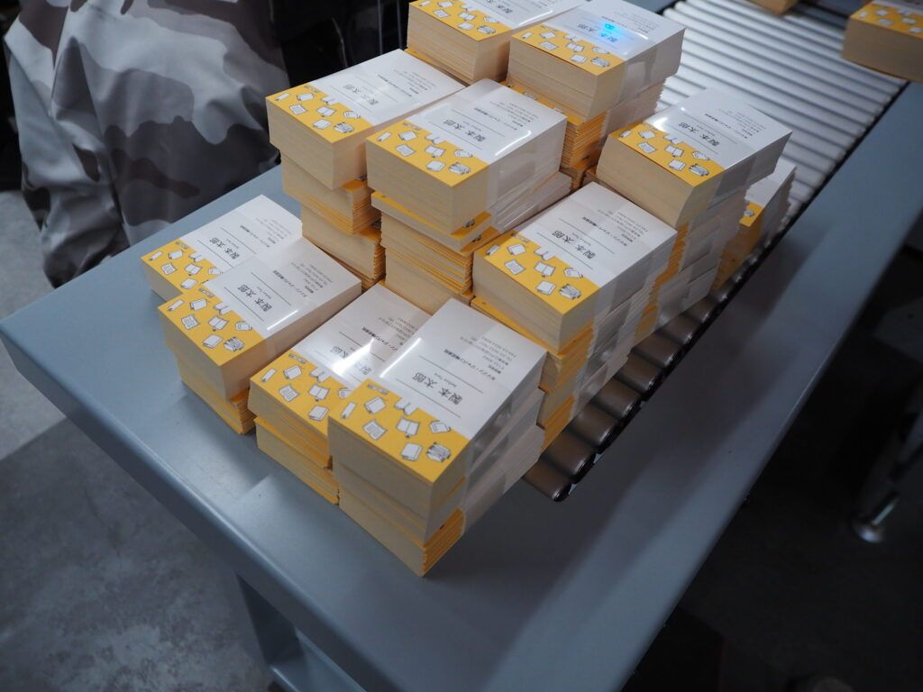 ロータリーダイカットシステムRD―N4055+SPC―N4055+GST50RDの実演では、カードまとめ装置により抜いた名刺を100枚にまとめ、ナガノ機械の自動帯掛け機で帯掛けするまでの自動化を披露した。
