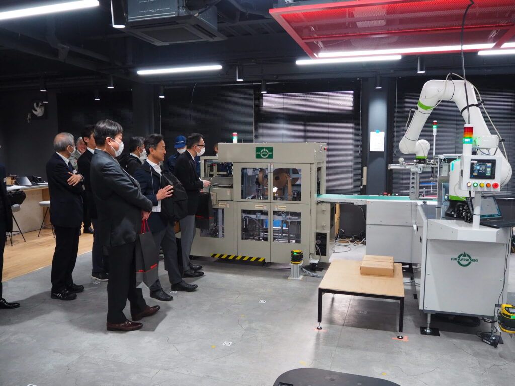 富士油圧精機のロールタイプ小型自動クラフト包装機を出展し、10冊ごとに交互に集積した中綴じ冊子の自動キャラメル包装を実演した。耳貼りを加圧しながら巻き込むため、中綴じ冊子でもしっかりと包むことができる。包装後は協働ロボットによりパレットに積み、AGVによる搬送までを披露した。