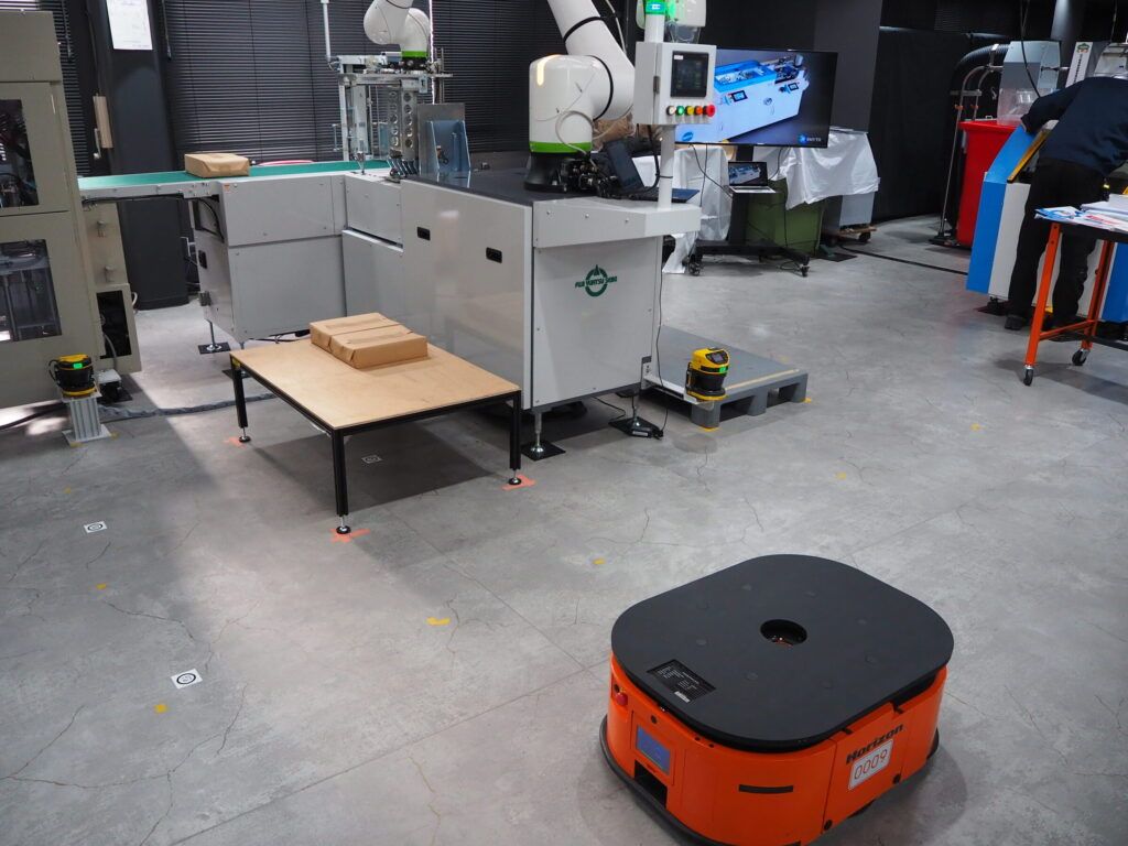 ⑤中綴じ包装機+協働ロボットパレタイズ+AGVでの自動搬送
