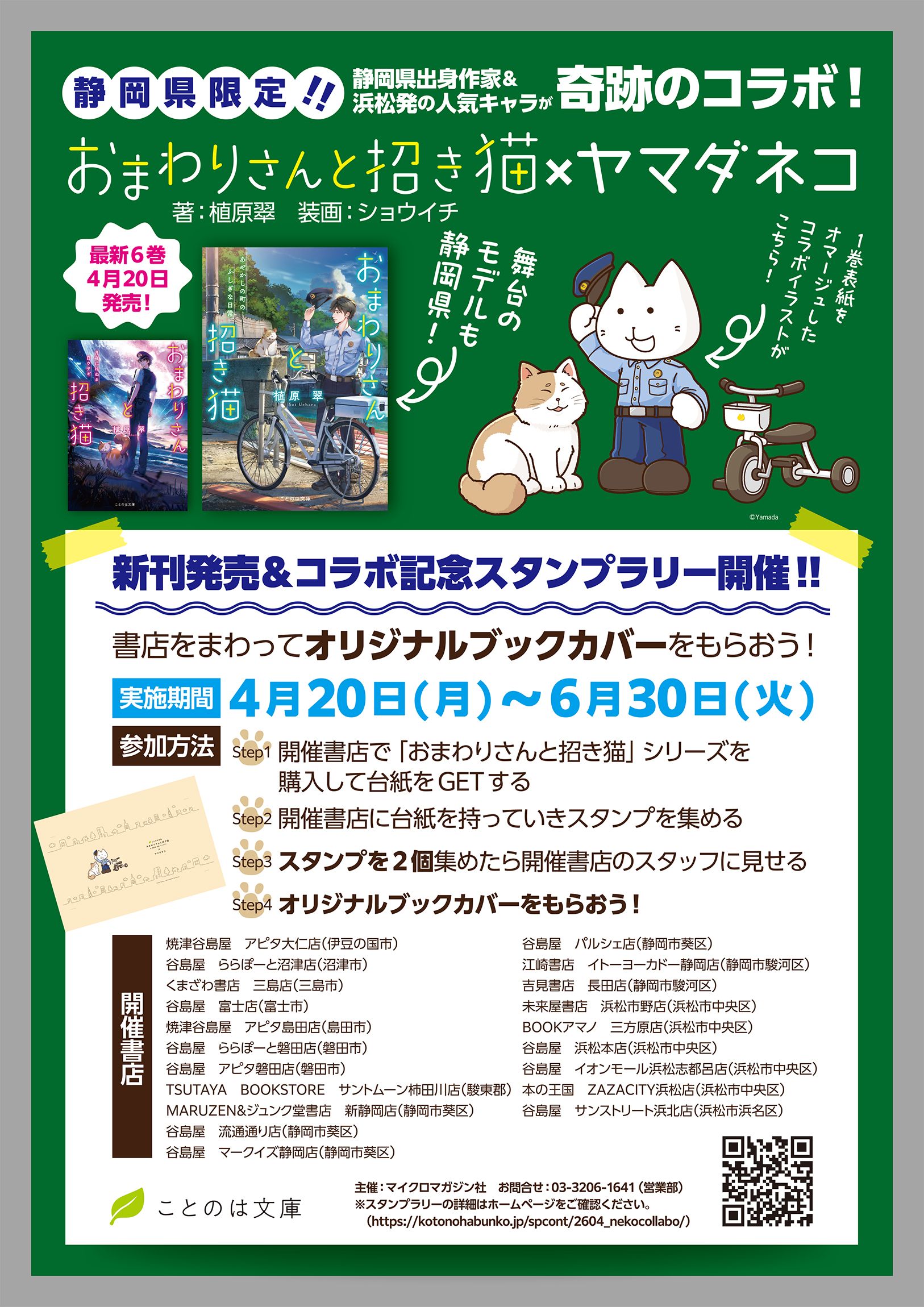マイクロマガジン社は4月20日、同社の文芸レーベル「ことのは文庫」の新刊『おまわりさんと招き猫 月夜にはねる白ウサギ』(著:植原翠/イラスト:ショウイチ)を発売。同日から6月30日まで、静岡県内の一部書店で特製ブックカバーがもらえるスタンプラリーを実施する。また、東海エリアの協力書店限定で、浜松発の人気キャラ・ヤマダネコとの描きおろしコラボイラストを使用した特製しおりも配布する。