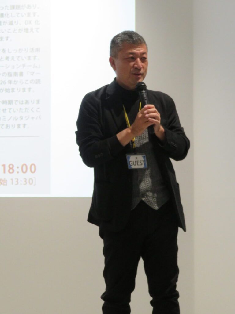 冒頭では、マーチング委員会の井上雅博理事長が登壇し、新しくなったコニカミノルタジャパン本社のオフィスで開催できたことへの感謝を述べた。続けて「ローカルゼブラ」の概念に触れ、地域への貢献と企業の成長を両立させる姿勢が持続可能な社会につながると語り、委員会活動の重要性を強調した。また、「マーチングイノベーション読本」をリリースしたことも紹介。著者である並木氏によるローカルゼブラや成熟社会の地域活性化についての解説に加え、マーチング委員会の活動内容も掲載されている。会員の助けとなるツールを今後も提供していく意欲を示した。