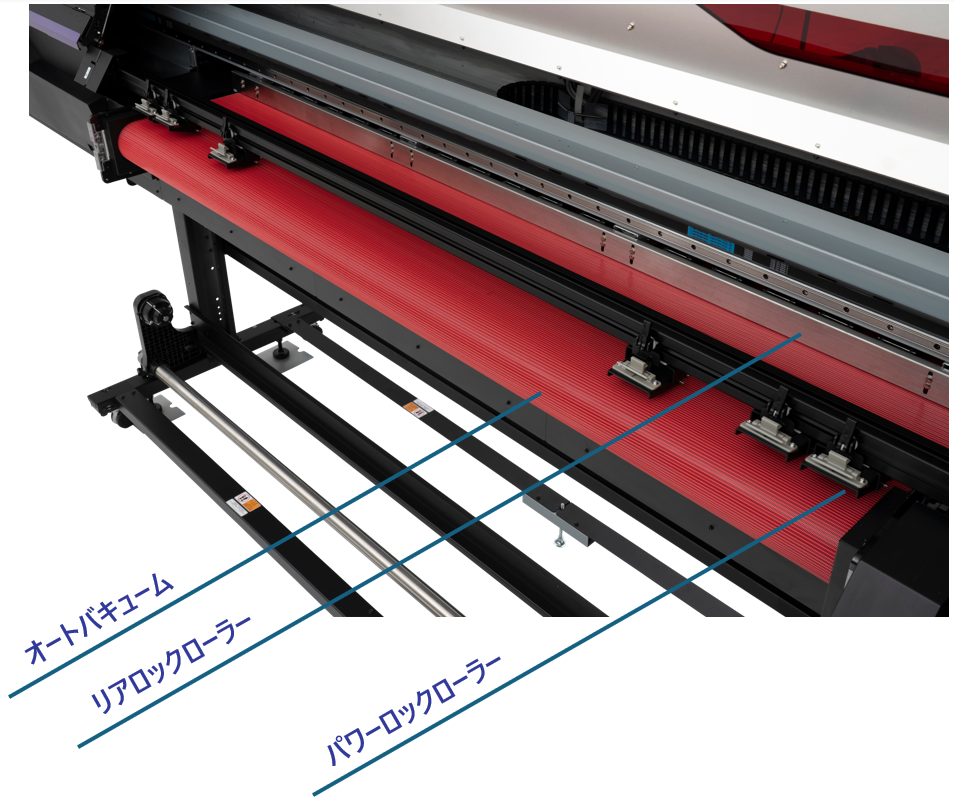 さまざまな素材への安定した出力を支えるため、新たに開発されたベルト搬送システムを採用している。従来の方式では対応が難しかった薄手のフィルムや布地についても、弛みやシワの発生を抑えた安定搬送が可能となった。これにより、ウィンドウグラフィックやファブリックサインなど活用の幅が大きく広がる。