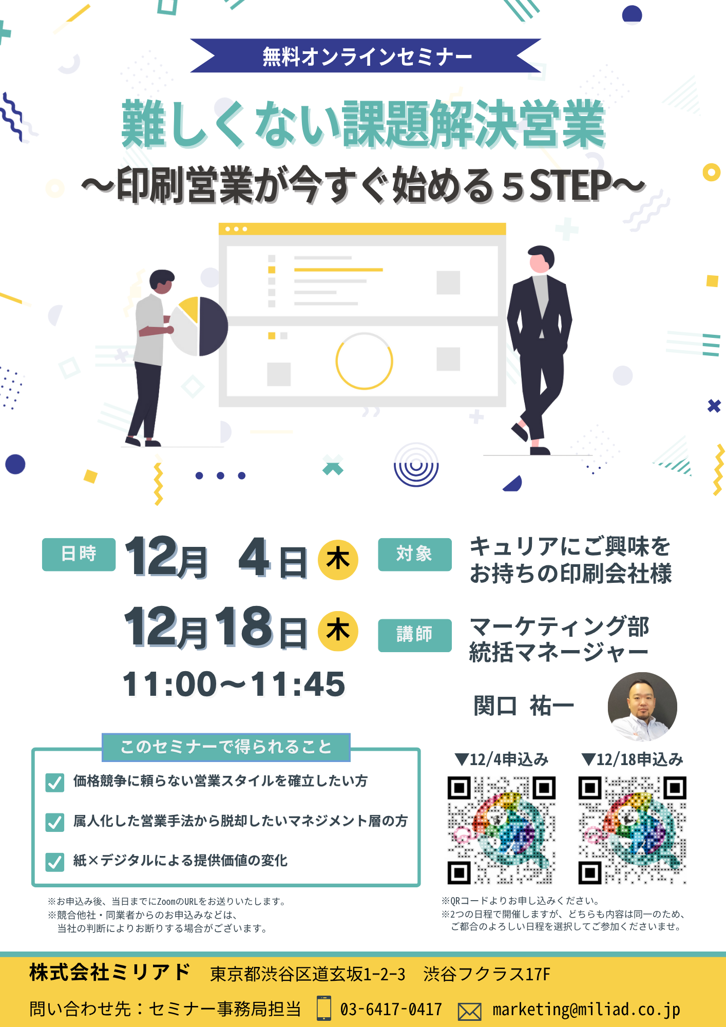 ミリアド 印刷営業の“次の一手”がわかるオンラインセミナー「難しくない課題解決営業〜印刷営業が今すぐ始める5STEP〜」開催 課題解決型営業の5STEPを体系的に解説する特別講座【12月4日・18日】