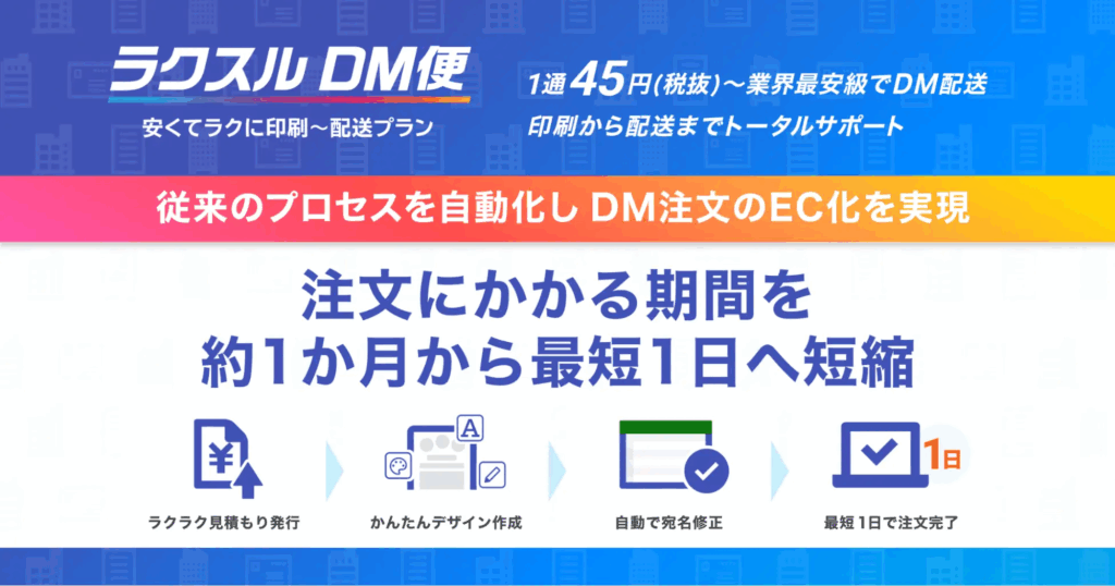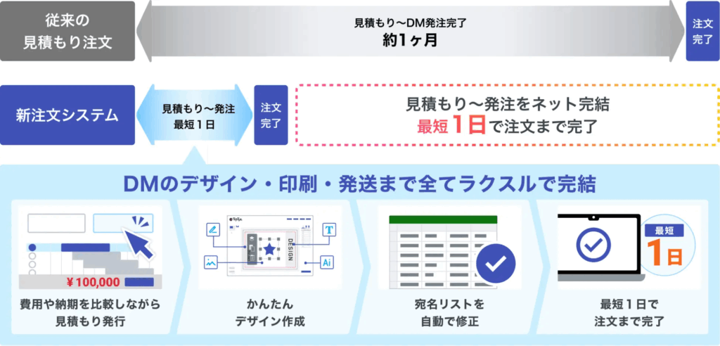 ラクスル株式会社は、セイノーグループの株式会社地区宅便と共同で提供する業界最安級のダイレクトメール(DM)サービス「ラクスルDM便」のシステムを刷新した。これまで見積もりやデザイン制作、データチェック、決済といった工程で必要だった人手を介するプロセスをテクノロジーによって自動化。オンラインで完結する仕組みを構築したことで、従来は約1か月を要していた注文完了までのリードタイムを最短1日へと劇的な短縮に成功している。