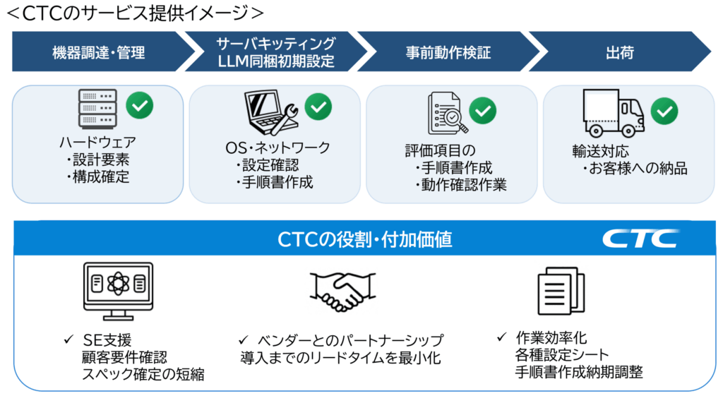 同ソリューションの提供にあたっては、CTCがリコー製LLMおよびDifyのプリインストール、出荷前の動作検証といったセットアップ作業を一括して対応する 。リコージャパンはこれらをパッケージ化し、顧客の業務に応じたAI活用の提案や商材の提供、運用支援を行う 。