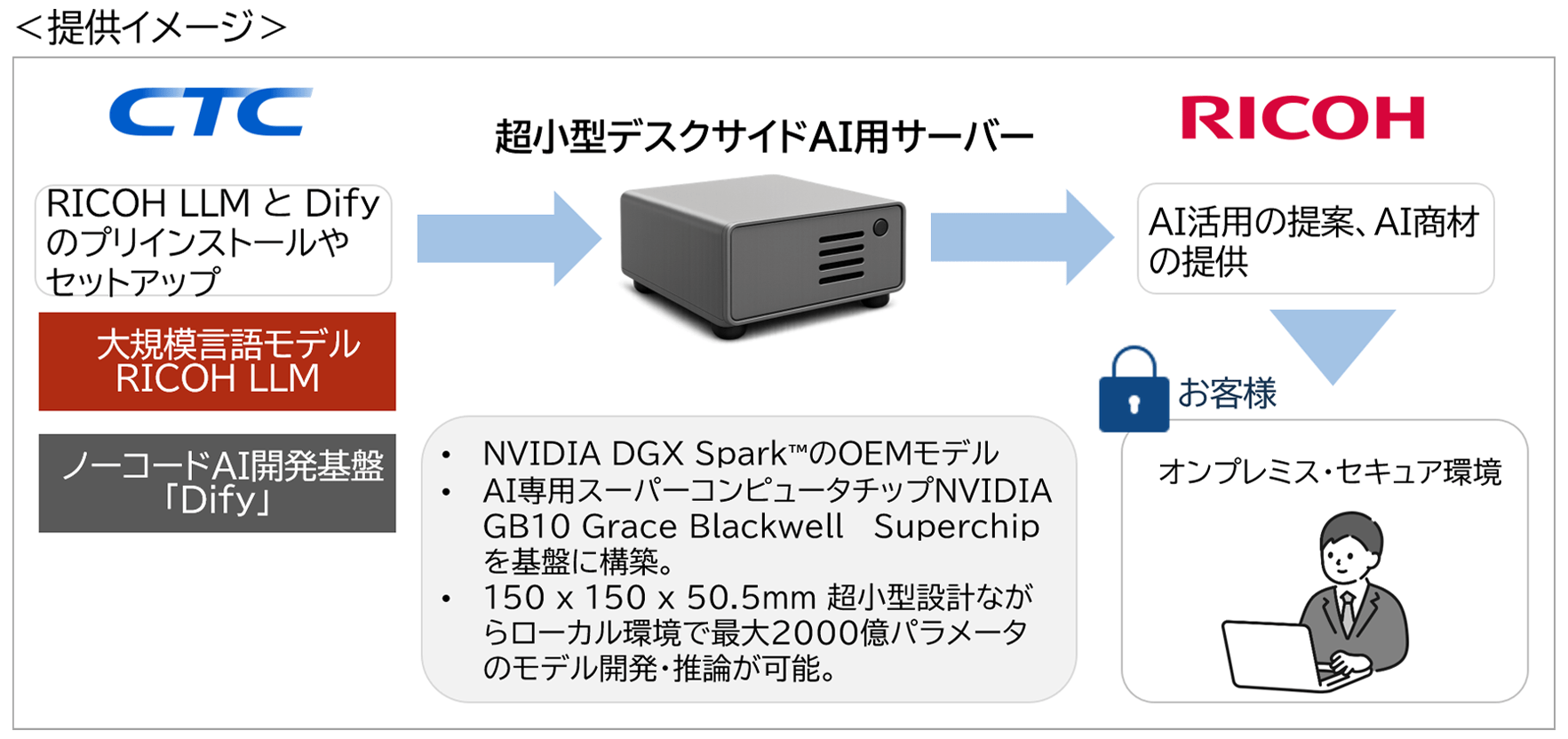 株式会社リコーおよびリコージャパン株式会社は、伊藤忠テクノソリューションズ株式会社(CTC)とオンプレミス環境でセキュアに生成AIを利用できるリコー製LLMを搭載した超小型デスクサイドAI用サーバーの提供を開始した 。同ソリューションは、設置場所を選ばない超小型筐体とリコー独自の大規模言語モデル(LLM)を組み合わせ、業務単位や担当者単位でのAI活用を支援する。