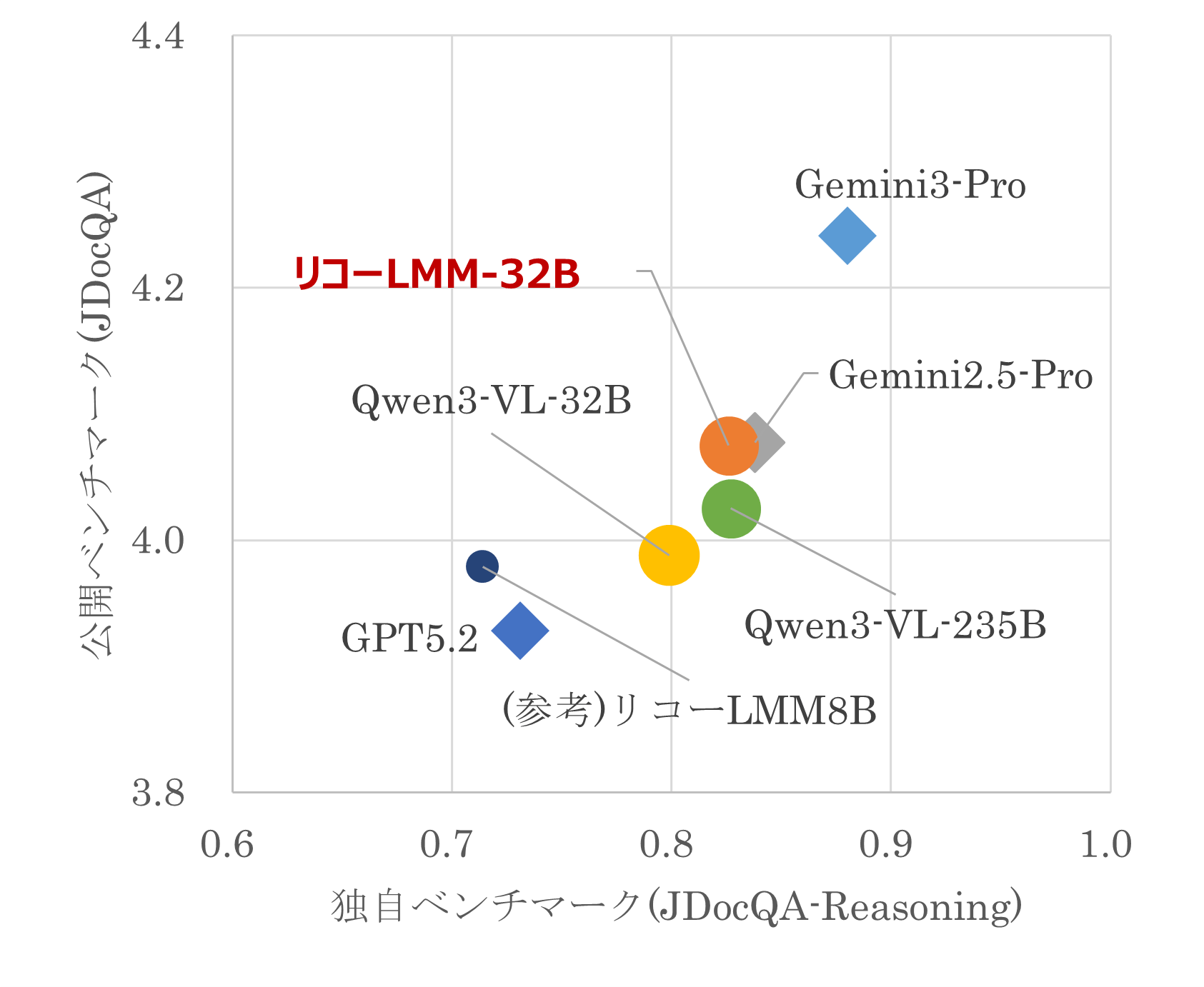 リコーは、2024年8月から実施されたGENIACの第2期で、700億パラメータのLMMを開発。その基本モデルおよび独自開発のベンチマークツールを無償公開した。2026年1月には、中国のアリババクラウドが開発・提供する大規模言語モデル(LLM)ファミリーの「Qwen2.5-VL-32B-Instruct」をベースとした320億パラメータのコンパクトなLMMを開発している。