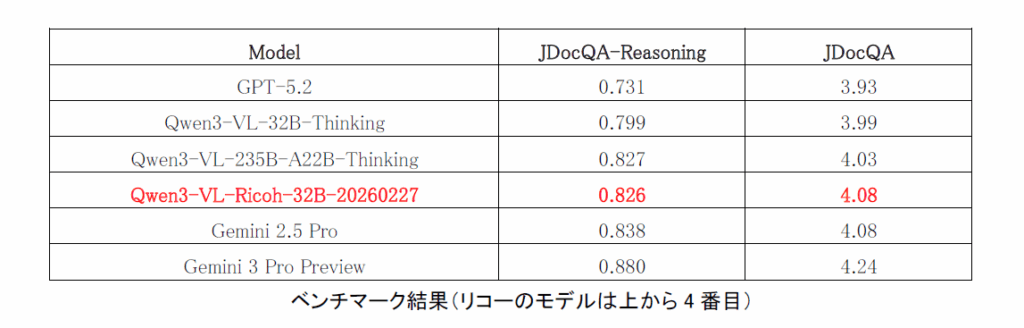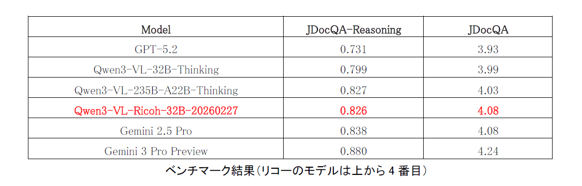 また、リーズニングLMMの開発で適用した技術を活用した軽量モデル「Qwen3-VL-Ricoh-8B-20260227」を、3月30日から無償公開。さらに、リーズニング性能の評価に特化したリコー独自開発のベンチマークツールも今後公開予定となっている。