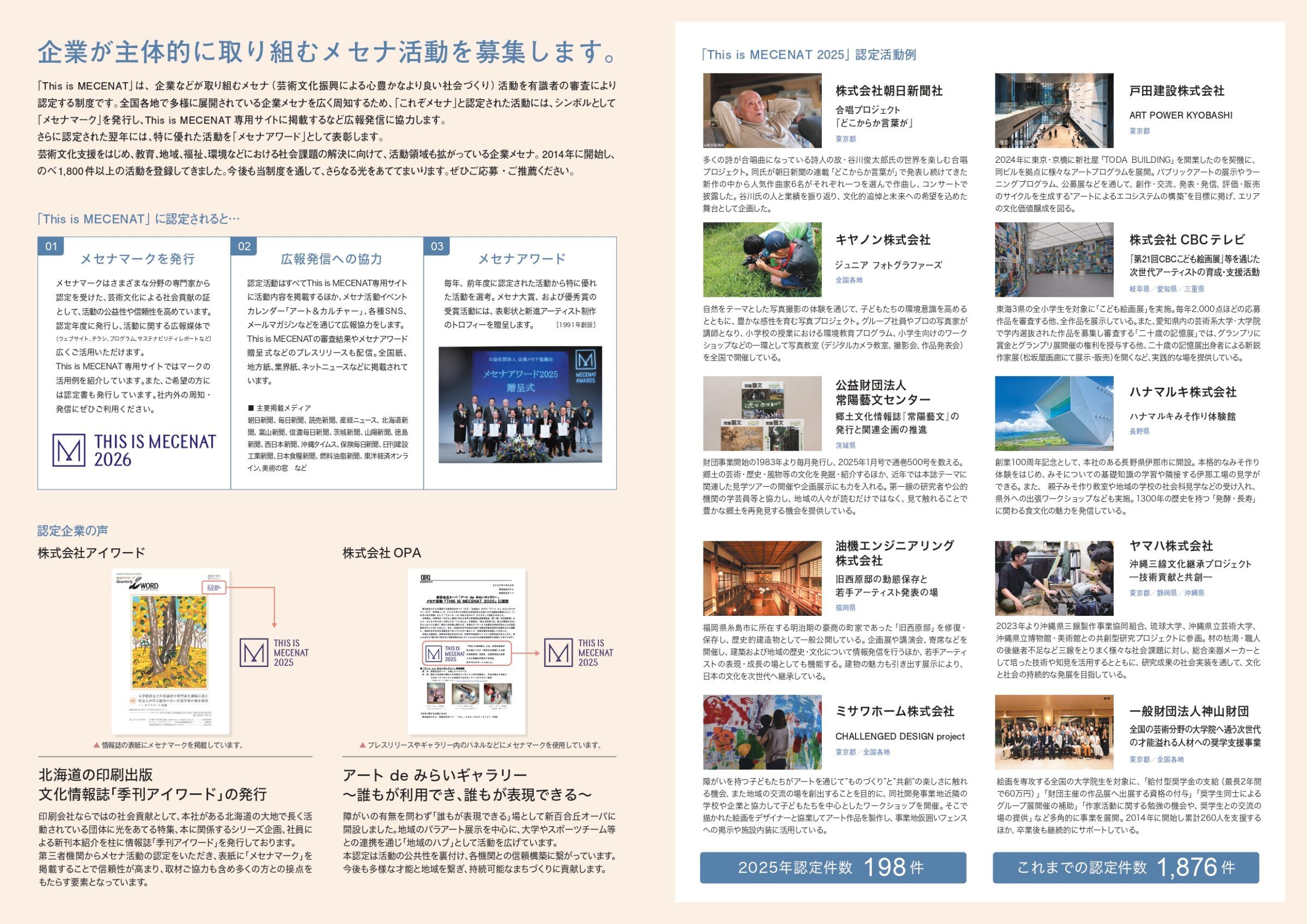 公益社団法人企業メセナ協議会は、企業や企業財団による芸術文化振興活動を認定する制度「This is MECENAT 2026」の応募受付を開始した 。同制度は、企業メセナの社会的意義を広く周知することを目的に2014年に創設され、これまでに延べ1,876件の活動を認定している 。