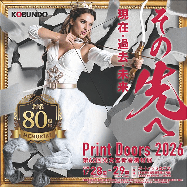 株式会社光文堂は2026年1月28日と29日の2日間、名古屋市国際展示場ポートメッセなごやで開催する「PrintDoors 2026(第62回新春機材展)」のポスターデザインを公開した。同展は、同社が販売する主要商材を集めた印刷機材総合展示会として開催しており、今回は創業80周年の節目の開催となる。