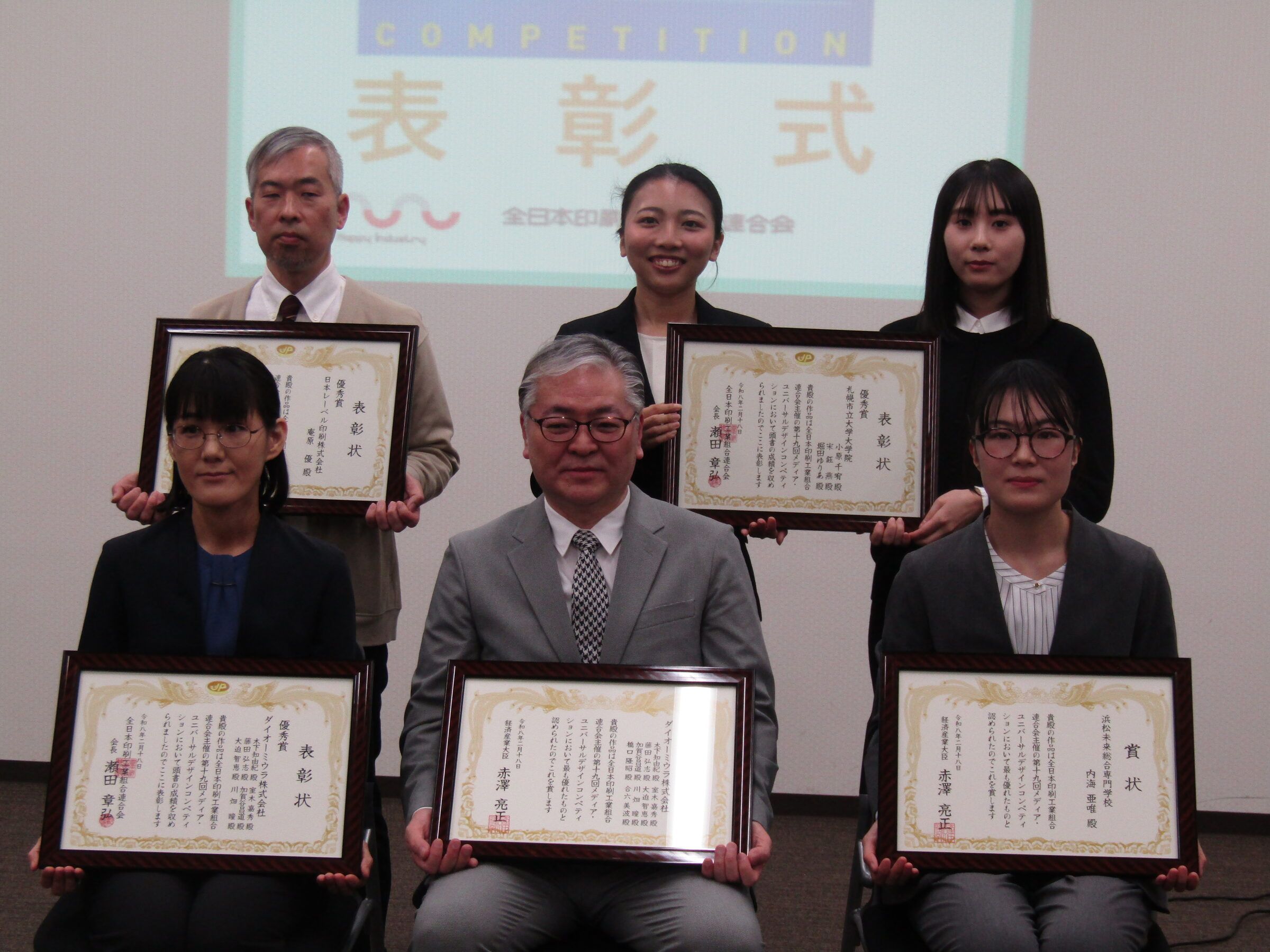 表彰式では、経済産業大臣賞一般の部を受賞したダイオーミウラ㈱の木下知由紀氏・大迫智恵氏と、学生の部を受賞した浜松未来総合専門学校・内海亜唯氏に、経済産業省商務・サービスグループ文化創造産業課の中村純典課長補佐から賞状と記念品が贈呈された。また、優秀賞一般の部を受賞したダイオーミウラ㈱の木下知由紀氏・大迫智恵氏、日本レーベル印刷㈱の庵原優氏、札幌市立大学大学院の小原千宥氏と堀田ゆりあ氏に瀬田会長から賞状と記念品が贈られた。