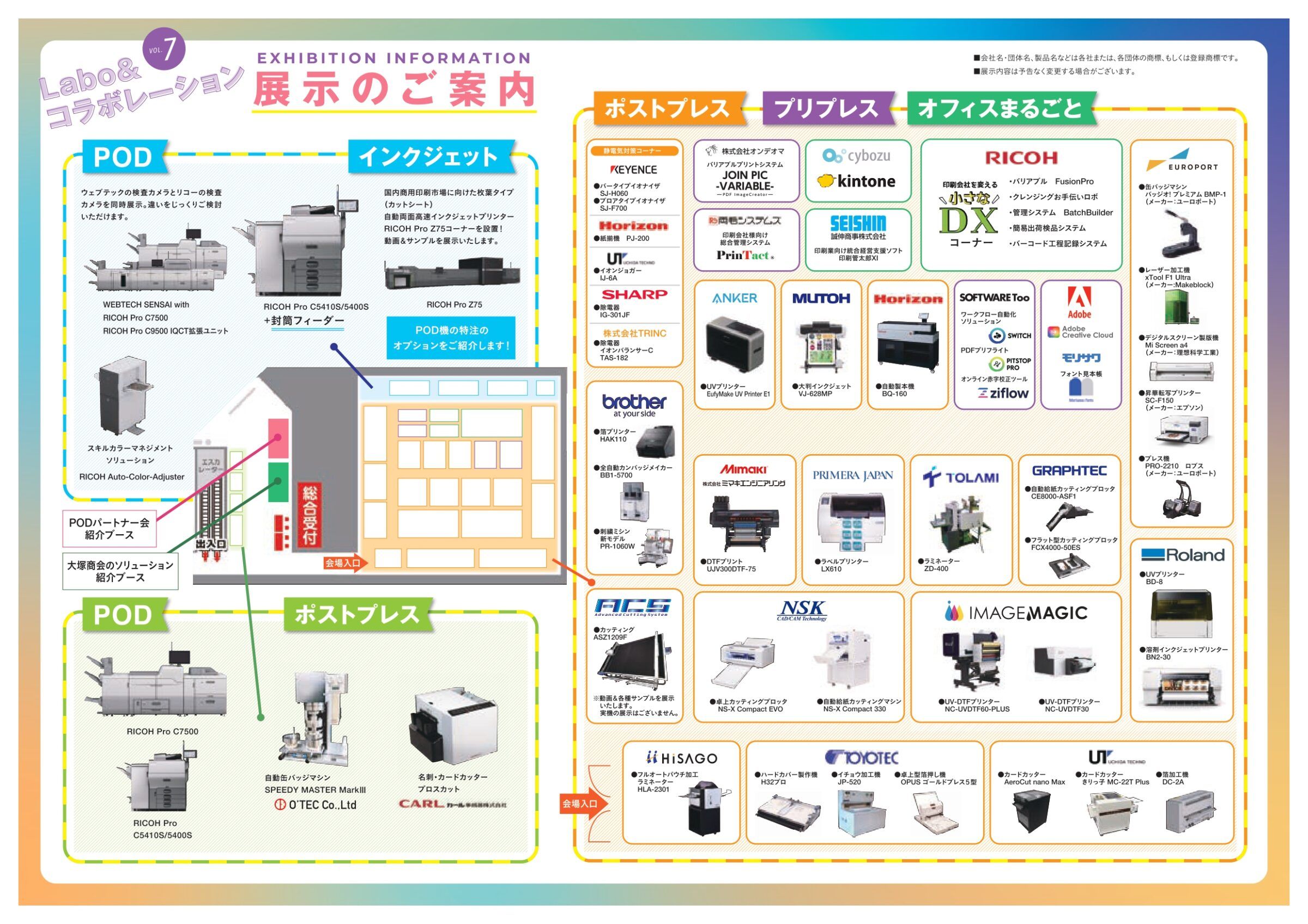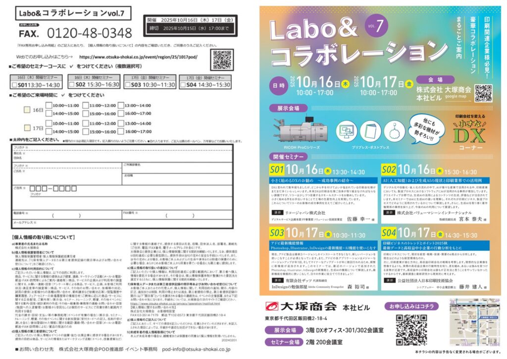 株式会社大塚商会は、10月16日と17日に東京・飯田橋の本社ビルで印刷業界向け展示イベント「Labo&コラボレーション Vol.7」を開催する。最新プロダクションプリンター(POD)や、プリプレス・ポストプレス機材、印刷関連システムをはじめとする20社以上の製品・ソリューションを一堂に紹介する。さらに、AIや生成AI、DX、小さな改善をテーマにしたセミナーを開催し、印刷業の最新動向と現場の課題解決を提示する。