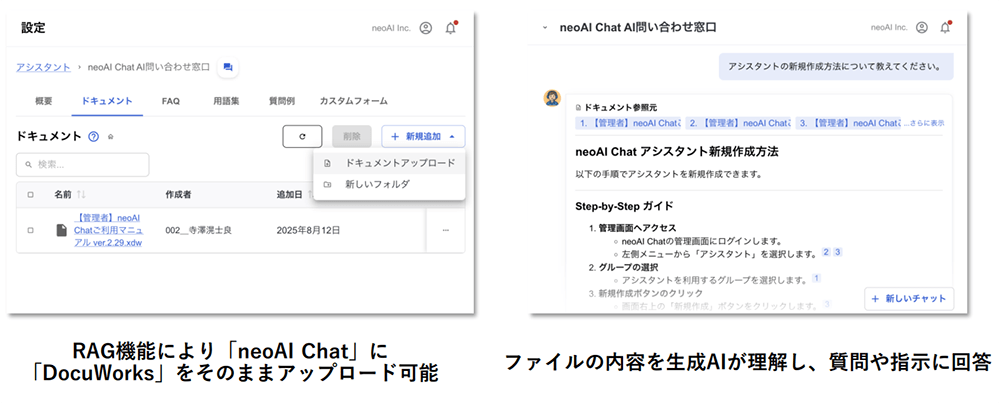 「DocuWorks」は電子の机を再現する「Desk」と、紙のように編集できる「Viewer」で構成されるソフトウェア。今回の連携では、neoAIのRAG(Retrieval-Augmented Generation)機能とOCR処理により、ファイル内の文字情報を高精度に抽出・理解する。これにより、ドキュメント管理や業務支援の精度が飛躍的に向上した。