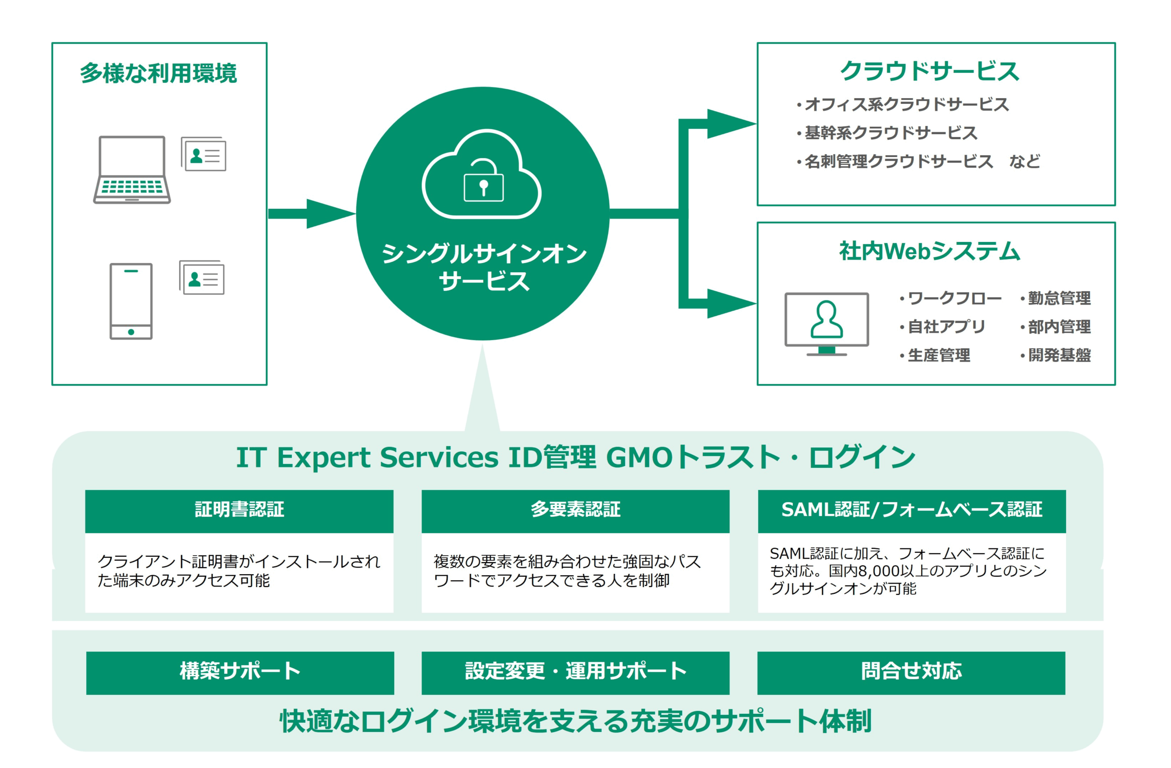 今回新たに提供された同サービスは、GMOグローバルサイン株式会社が展開する「GMOトラスト・ログイン」を基盤とし、SAML認証やフォームベース認証を用いて複数システムの認証情報を集約。ユーザーは一度の認証操作で複数のアプリケーションを利用でき、管理者側の業務負担も軽くなる。
