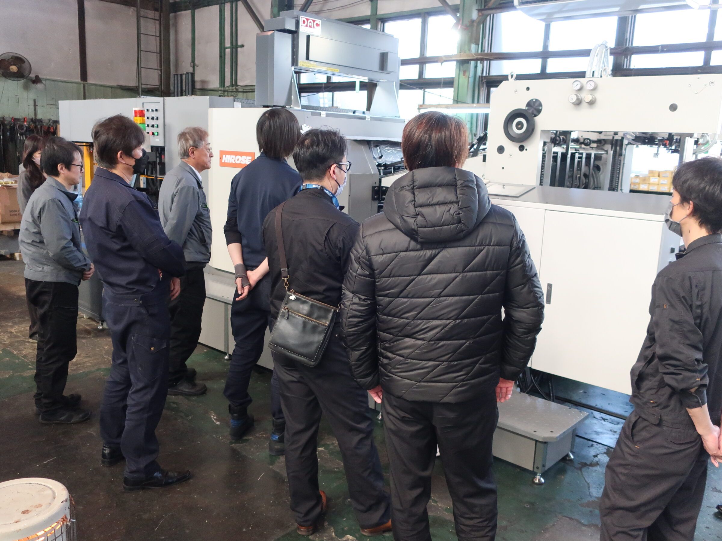 会場では担当者による解説と実機デモが行われ、来場者は装置の性能や運用方法について熱心に質問。印刷後工程の省人化や品質管理の強化が求められる中、現場課題に対応する実用的な設備として注目を集めた内覧会となった。