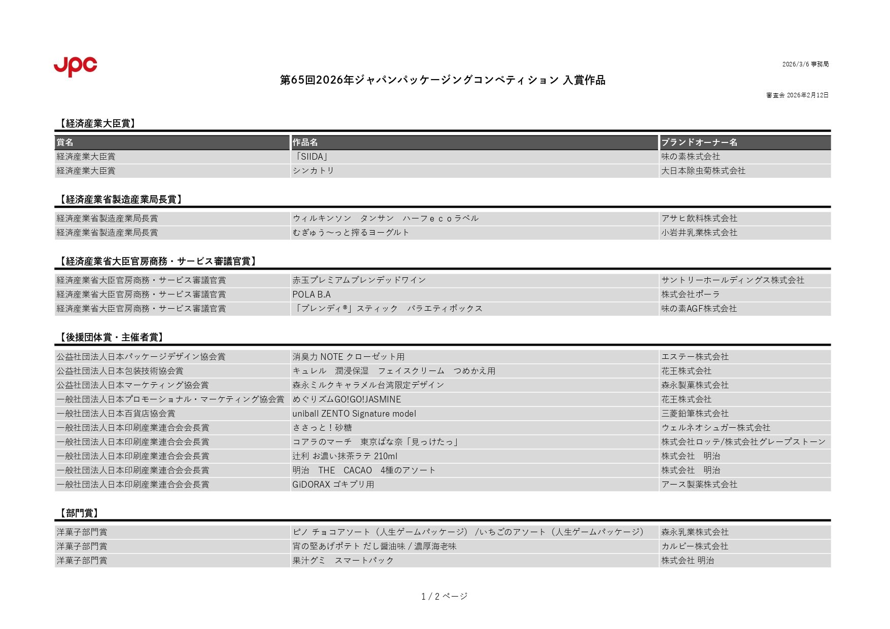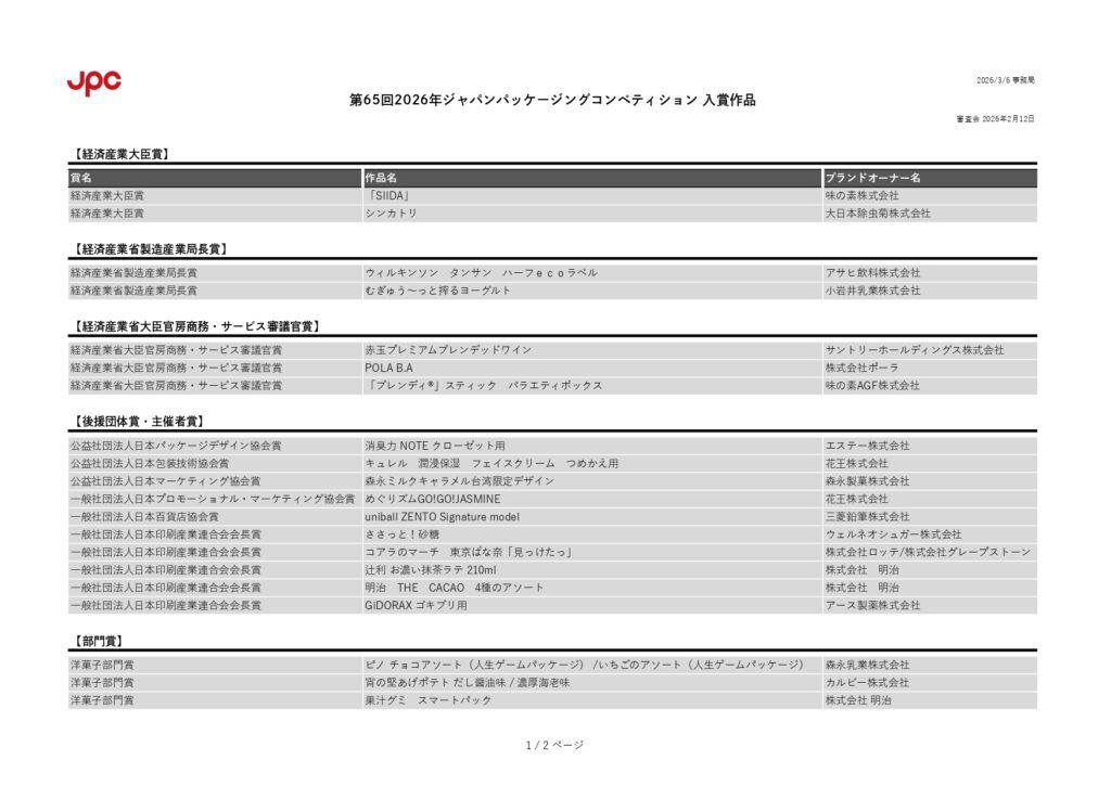 一般社団法人日本印刷産業連合会は、「第65回 2026年ジャパンパッケージングコンペティション(JPC2026)」の入賞作品を発表した 。146点の応募作品の中から計41作品が入賞し、経済産業大臣賞には味の素株式会社の「SIIDA」と、大日本除虫菊株式会社の「シンカトリ」が選出された。