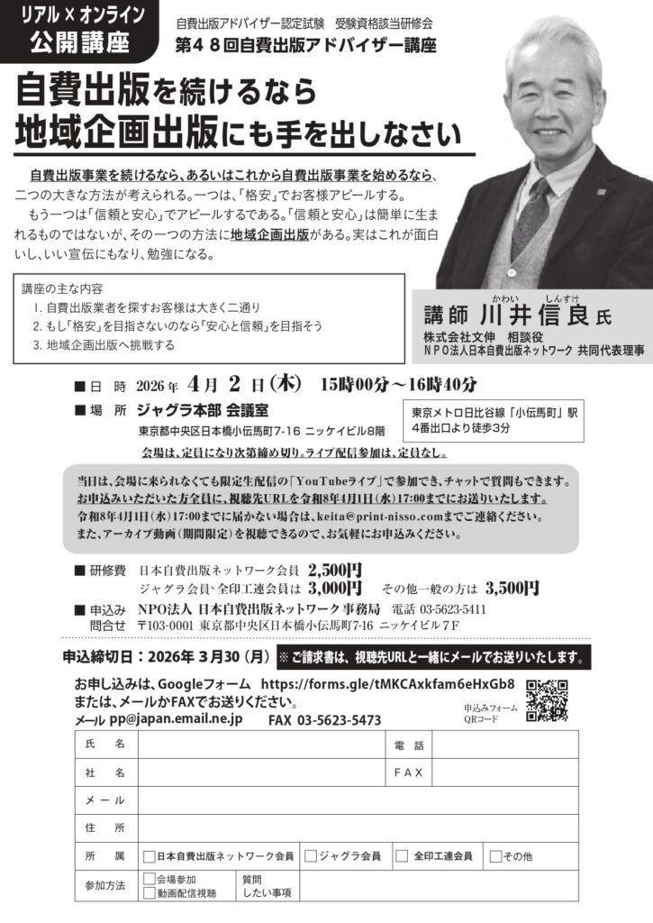 NPO法人日本自費出版ネットワークは4月2日、第48回自費出版アドバイザー講座を開催する。同講座は「自費出版アドバイザー認定試験」の受験資格に該当する研修会として実施される。リアル会場とオンラインを併用した形式で、自費出版事業における信頼性の構築や新たな販路開拓について提示する。