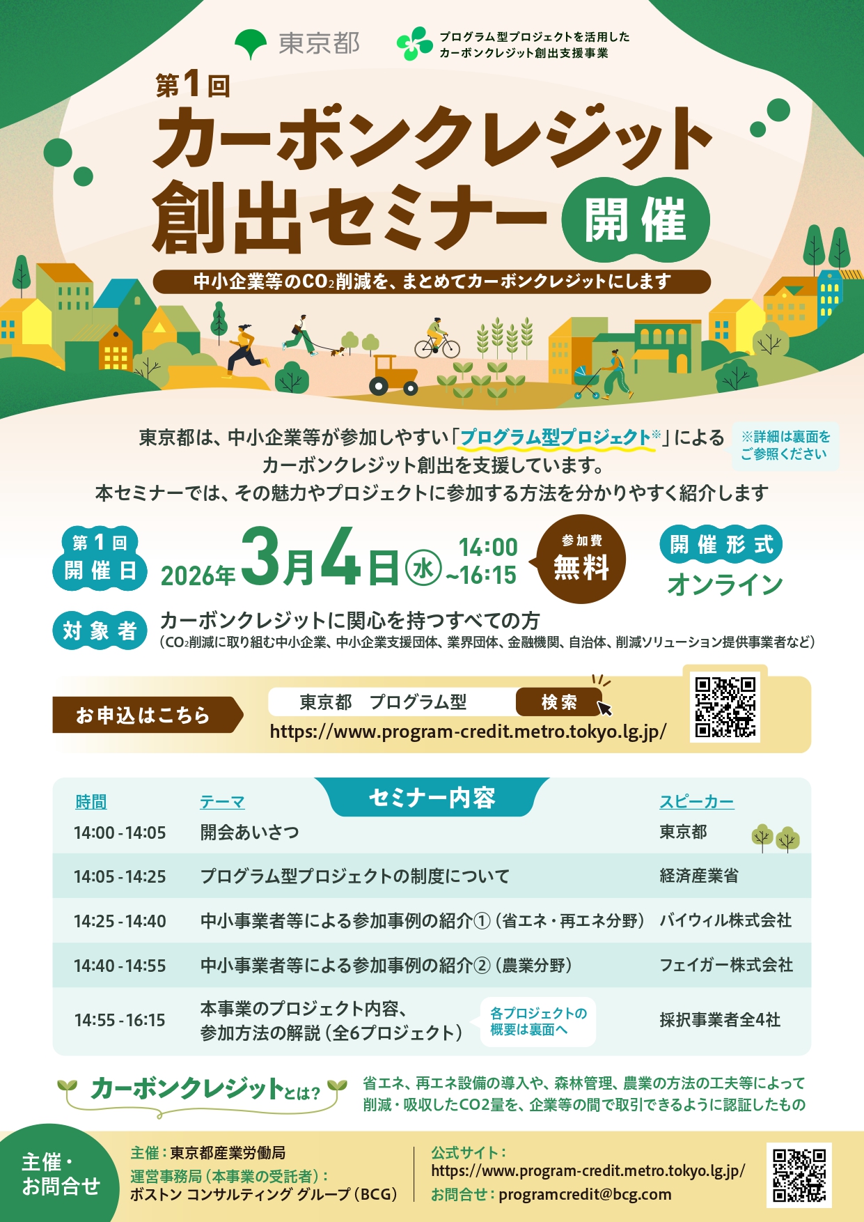 東京都は、都内中小企業等の脱炭素化促進に向け、「カーボンクレジット創出セミナー」を開催する。同セミナーは、小規模な排出削減活動を取りまとめてクレジット創出を目指す「プログラム型プロジェクトを活用したカーボンクレジット創出支援事業」の一環として実施される。