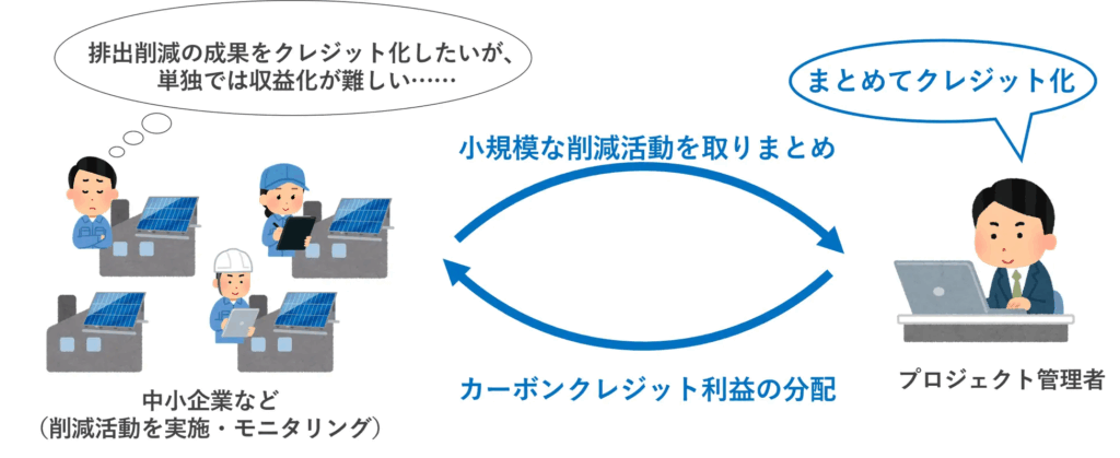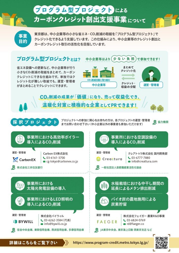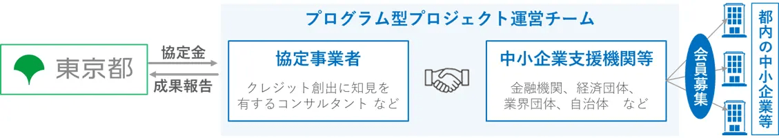 東京都の支援事業は、経済団体や金融機関等と連携し、都内中小企業等の削減・吸収活動のクレジット化に取り組む事業者に対し、成果連動型の協定金により支援を行う。これにより、従来はコスト面で見合わなかった小規模な活動でも、全国的に注目を集める「プログラム型プロジェクト」を通じてクレジット化が可能となる。