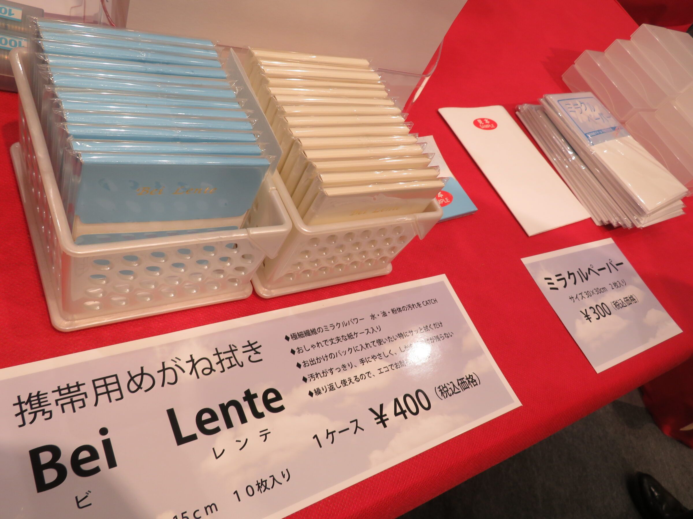 また有限会社祥山堂は、古地図をデザインしたクリアファイルやブックカバー、繰り返し使えるレンズクリーニングペーパー「Bei Lente(ビレンテ)」を紹介。Bei Lenteはアクリル極細繊維を特殊構造で仕上げた不織布で、水洗いして繰り返し使用できる。メガネだけでなくスマートフォンの液晶などにも使用でき、携帯性の高さも人気となっている。