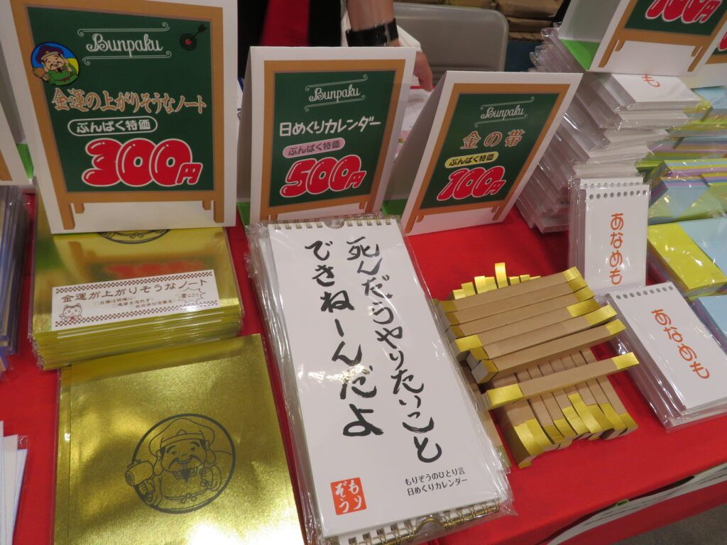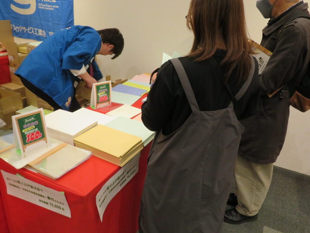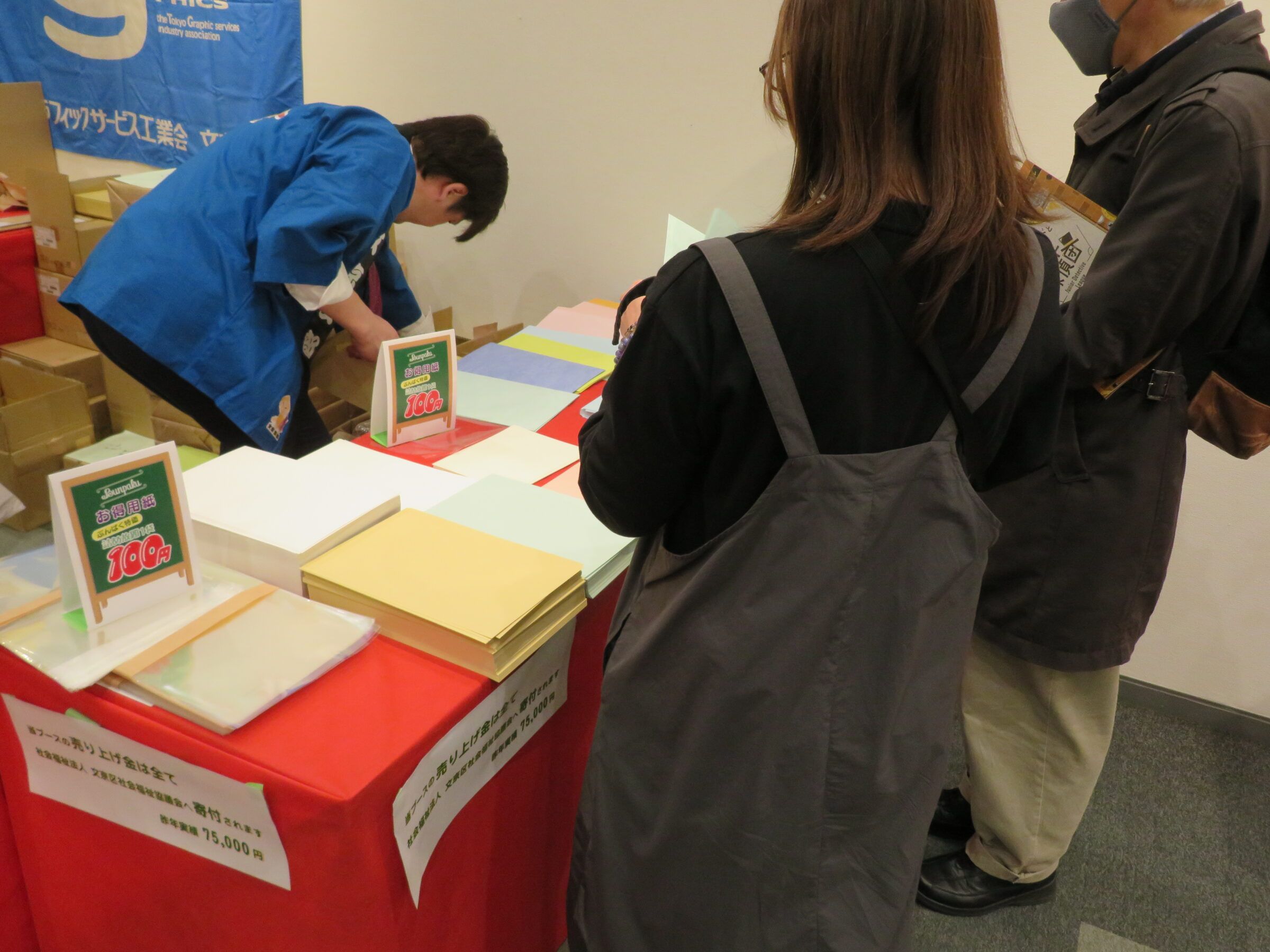 東京グラフィックサービス工業会文京支部は、文京区オリジナルキャラクター「BUNレンジャー」のグッズや金色を基調とした縁起物アイテムを紹介。目玉となっていたのは、100円で紙を詰め放題できるブースで、大きな人だかりができていた。柄入りの薄紙や、文様の入った厚紙などさまざまな紙が並んでおり、特に中綴じ冊子の表紙などに使用できる強度がある髪は人気を集めていた。来場者は「子どもの図画工作用に」「グリーティングカードなどのハンドメイドに活用したい」と語り、詰め放題を楽しんだ。
